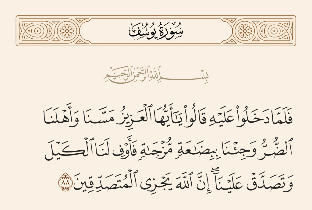 قال تعالى: «فَلَمَّا دَخَلُوا عَلَيْهِ قالُوا يا أَيُّهَا الْعَزِيزُ مَسَّنا وَأَهْلَنَا الضُّرُّ وَجِئْنا بِبِضاعَةٍ مُزْجاةٍ فَأَوْفِ لَنَا الْكَيْلَ وَتَصَدَّقْ عَلَيْنا إِنَّ اللَّهَ يَجْزِي الْمُتَصَدِّقِينَ».