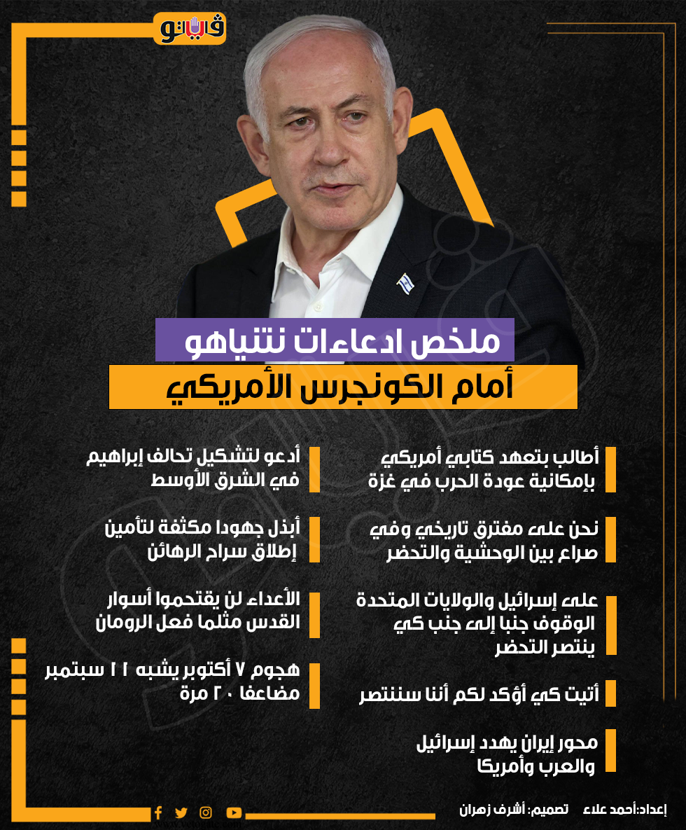 ملخص ادعاءات نتنياهو أمام الكونجرس الأمريكي (إنفوجراف) الأربعاء 24/يوليو/2024 - 11:09 م 7/24/2024 11:09:40 PM نتنياهو، فيتو احمد علاء تنفيذ: أشرف زهران شارك طباعة 18 حجم الخط شارك طباعة رئيس حكومة الاحتلال بنيامين نتنياهو الكونجرس الامريكي الولايات المتحدة إسرائيل خطاب نتنياهو