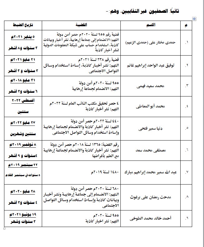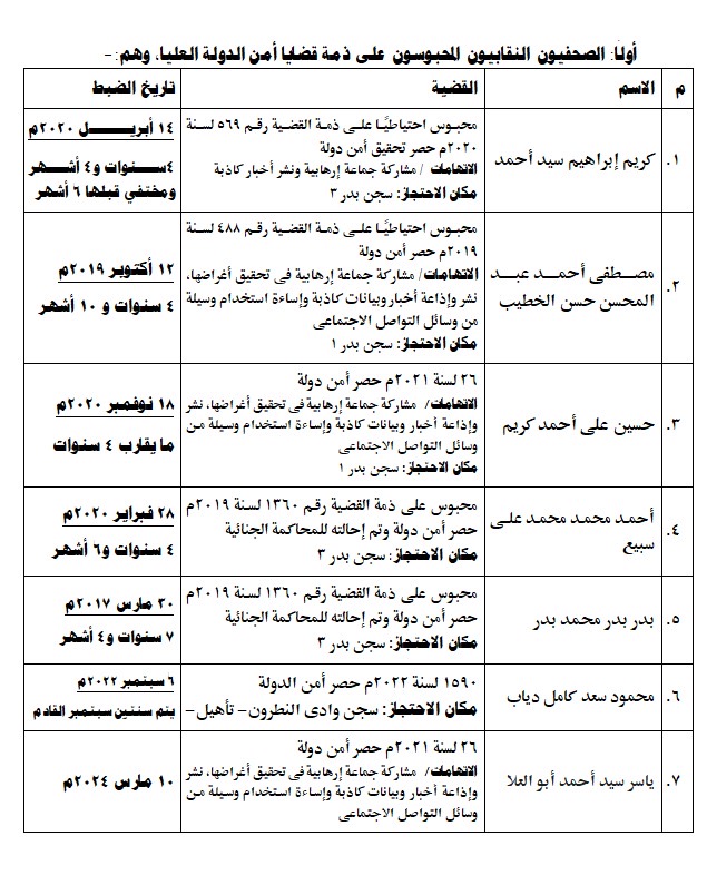 أولًا: إطلاق سراح جميع الصحفيين المحبوسين والإفراج عن سجناء الرأي الذين لم يتورطوا في عنف، ومن هذا المنطلق فإن النقابة، تتقدم لحضراتكم بقائمة كاملة بكل الصحفيين المحبوسين "نقابيون وغير نقابيين" ونتمنى أن يكون من بين مخرجات هذا الحوار إعادة النظر في أوضاعهم وإطلاق سراحهم خاصة أن أغلبهم تجاوزت فترات حبسهم الاحتياطي عامين كاملين "مرفق قائمة"مفصلة بالاسماء والقضايا".
