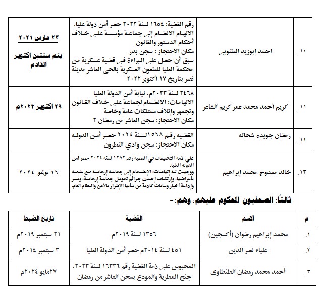 تقدم الكاتب الصحفي خالد البلشي، نقيب الصحفيين، بقائمة تضمن ٢٦ صحفيًا نقابيًا وغير نقابي، منهم ١٣ محتجزًا و٣ محكوم عليهم، للأمانة العامة للحوار الوطني أثناء مناقشتها ملف الحبس الاحتياطي ضمن ملفات المحور السياسي للحوار.