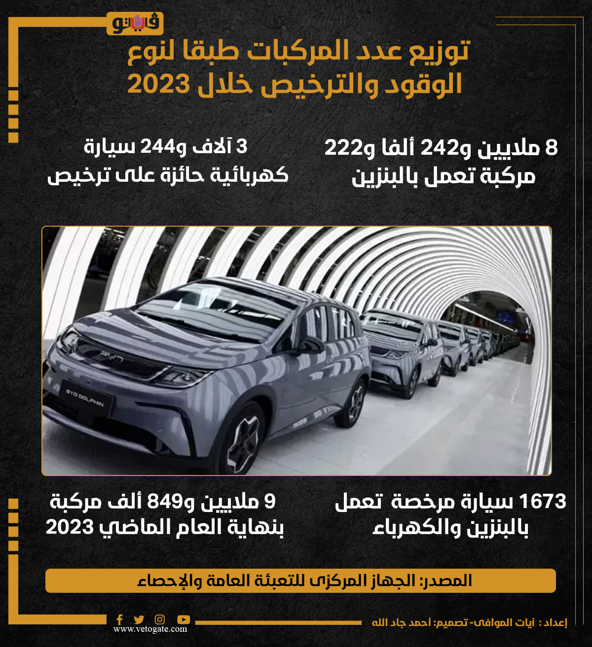توزيع عدد المركبات طبقا لنوع الوقود والترخيص خلال 2023 (إنفوجراف) الجمعة 26/يوليو/2024 - 08:00 م 7/26/2024 8:00:26 PM صورة أرشيفية آيات الموافى شارك طباعة 18 حجم الخط شارك طباعة الجهاز المركزى للتعبئة العامة والإحصاء البنزين والكهرباء