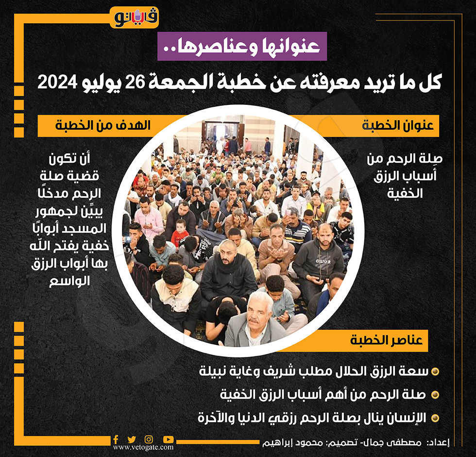 عنوانها وعناصرها.. كل ما تريد معرفته عن خطبة الجمعة 26 يوليو 2024 (إنفوجراف) الخميس 25/يوليو/2024 - 01:10 م 7/25/2024 1:10:53 PM خطبة الجمعة، فيتو مصطفى جمال شارك طباعة 18 حجم الخط شارك طباعة خطبة الجمعة صلة الرحم خطبة الجمعة القادمة أبواب الرزق خطيب الجمعة مسجد الامام الحسين