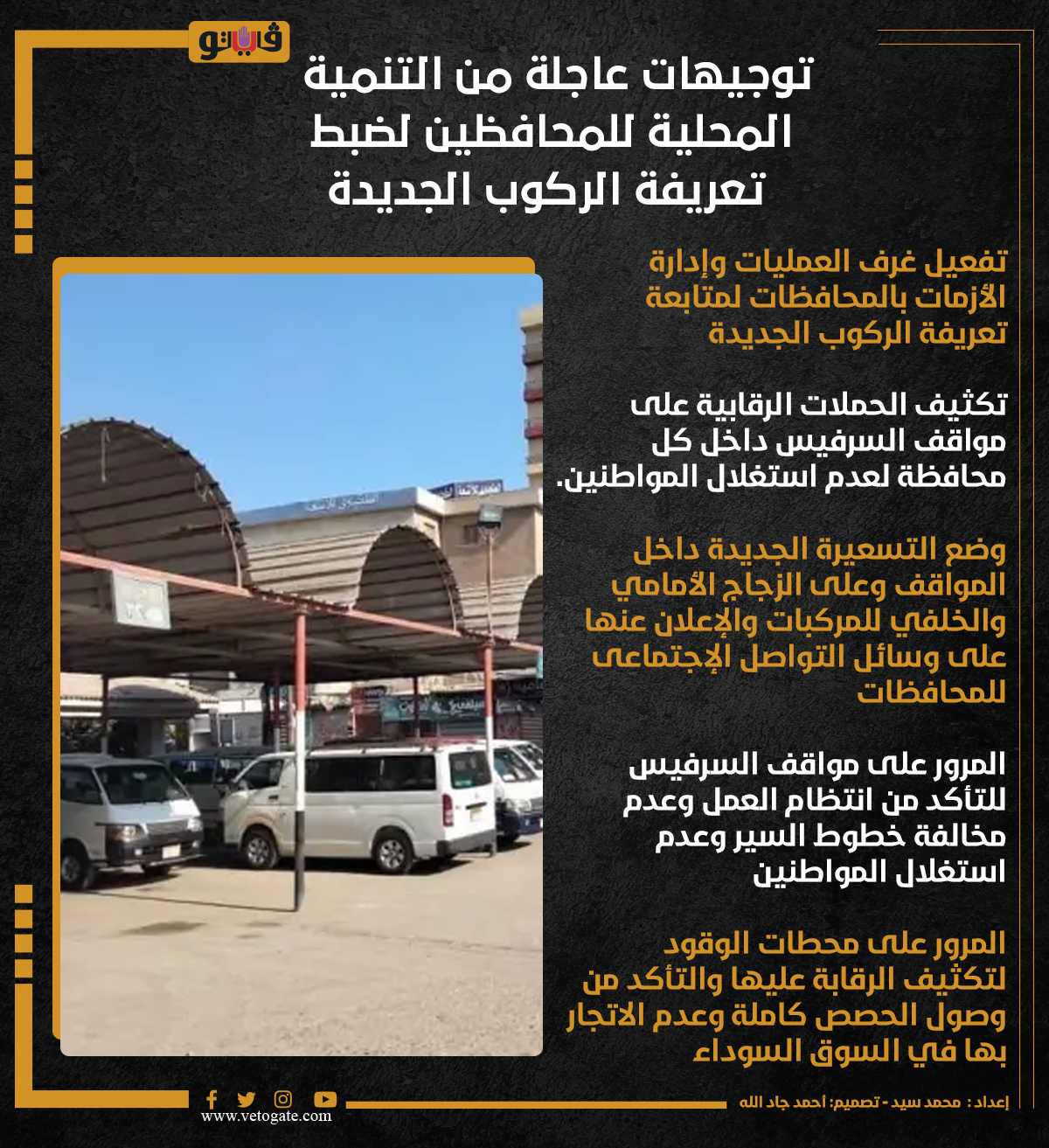 توجيهات عاجلة من التنمية المحلية للمحافظين لضبط تعريفة الركوب الجديدة (إنفوجراف) الخميس 25/يوليو/2024 - 10:20 م 7/25/2024 10:20:55 PM تعريفة الركوب الجديدة، فيتو أماني فلفل شارك طباعة 18 حجم الخط شارك طباعة التنمية المحلية التسعيرة الجديدة التواصل الاجتماعي