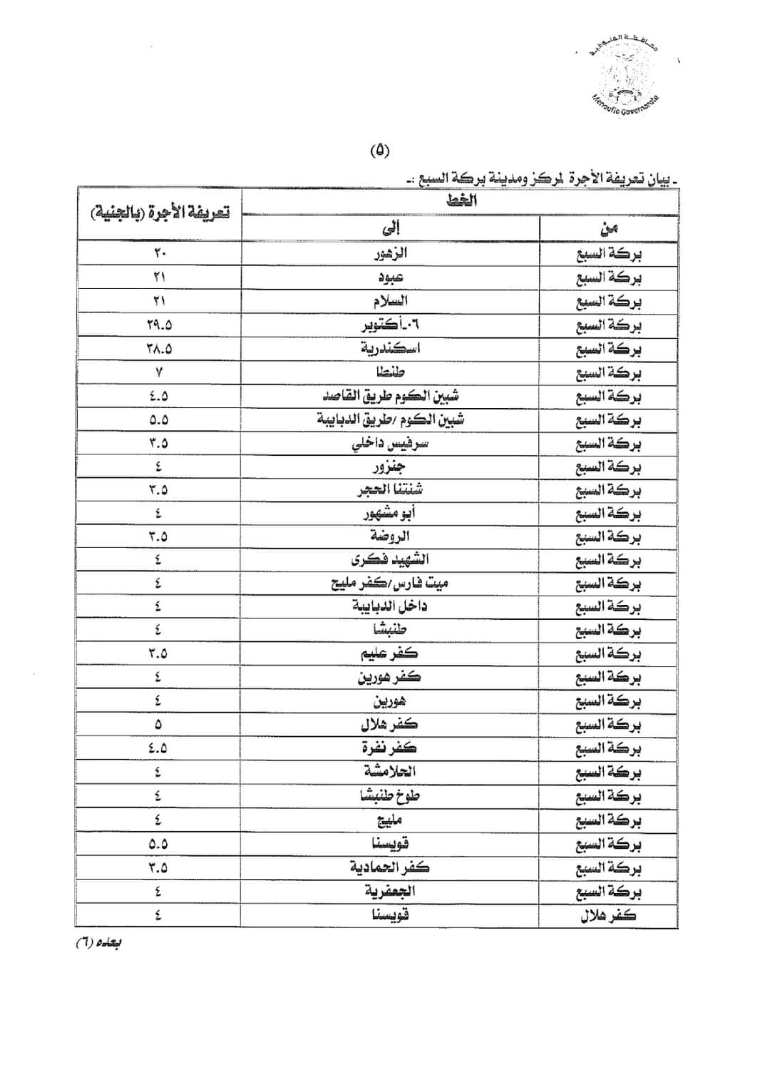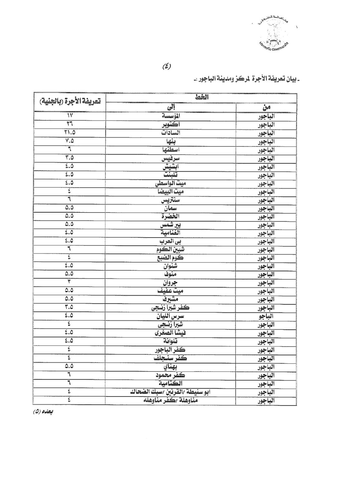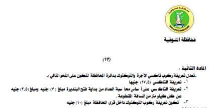وتضمنت المادة الثانية من القرار تعديل تعريفة ركوب تاكسي الأجرة الـ 17,5 جنيه، وكذا تعديل محاسبة العداد من بداية فتح البنديرة بمبلغ 7 جنيه ومبلغ 2,5 جنيه عن كل 1 كيلو متر من المسافة المقطوعة، و10 جنيهات تعريفة الركوب الجديدة لمركبات التوكتوك داخل قري المحافظة.