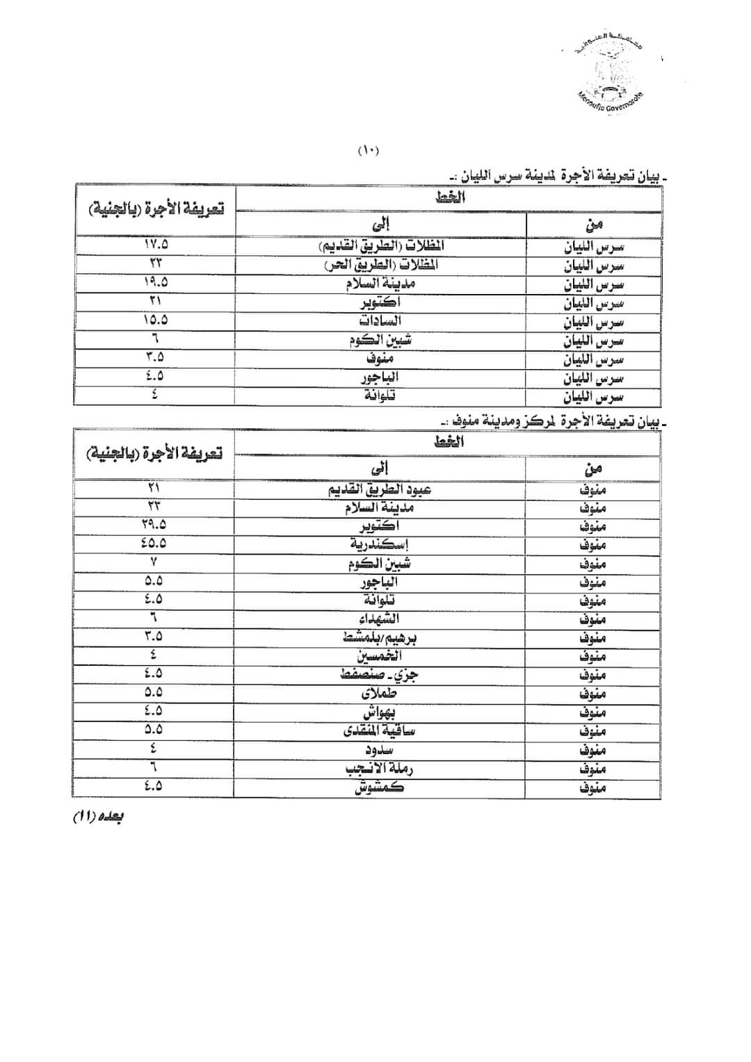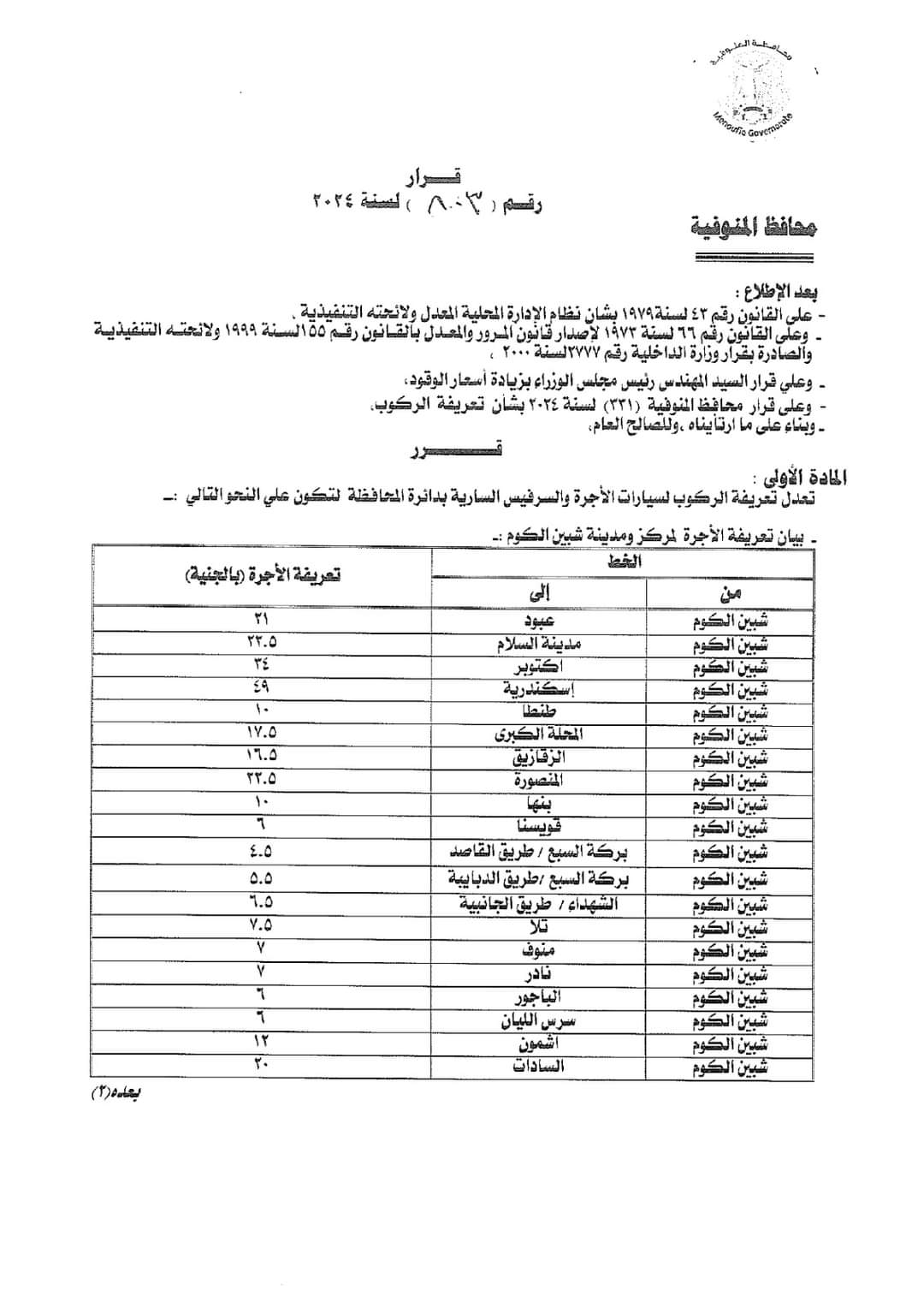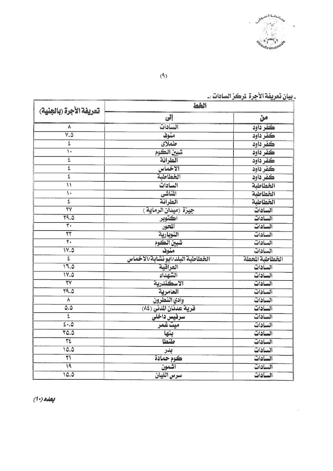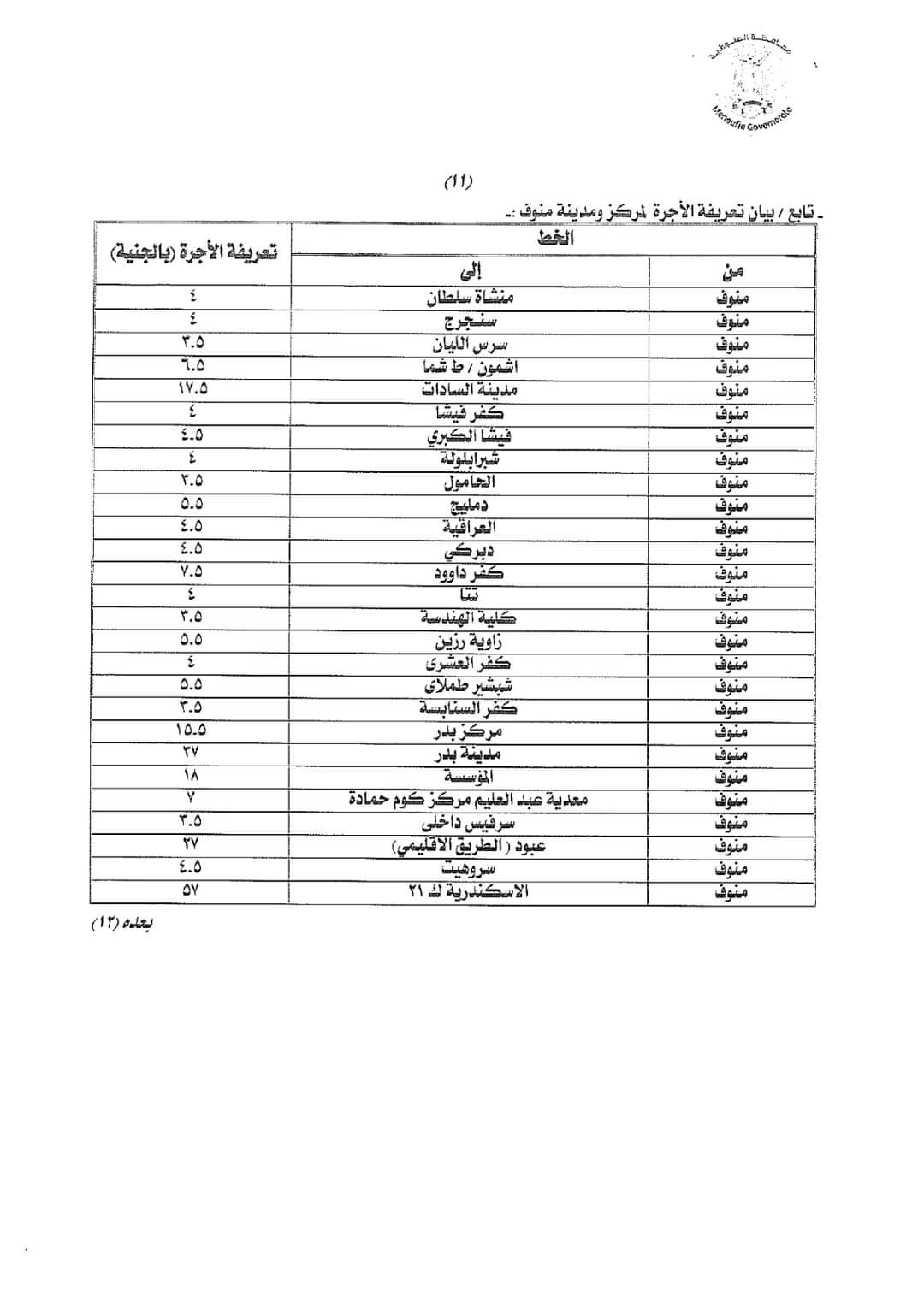 محافظ المنوفية يعلن التعريفة الجديدة لوسائل المواصلات (صور)