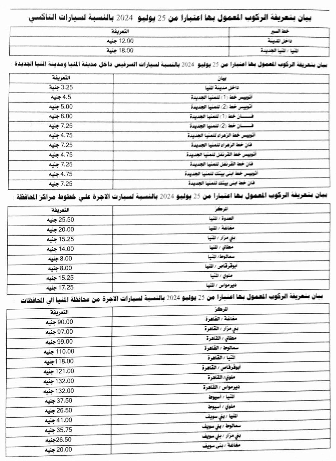 فيما تم زيادة تعريفة أجرة سيارات السرفيس داخل مدينة المنيا إلى 3 جنيهات، والتاكسي داخل المدينة 12 جنيها، والتاكسي شرق النيل 18 جنيها.