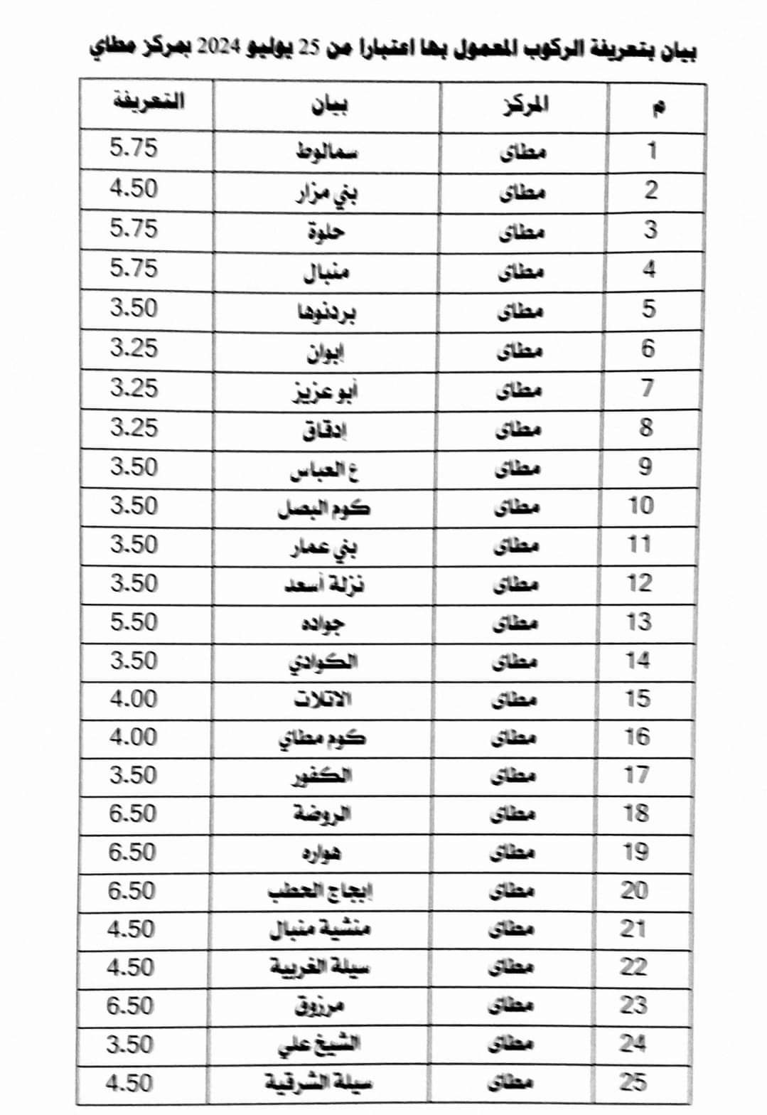 تعريفة الركوب الجديدة في المنيا