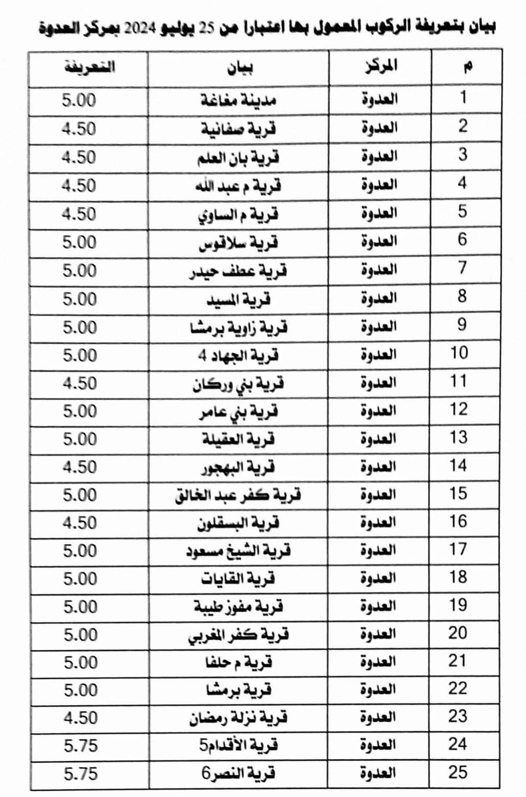 تعريفة الركوب الجديدة في المنيا 2024