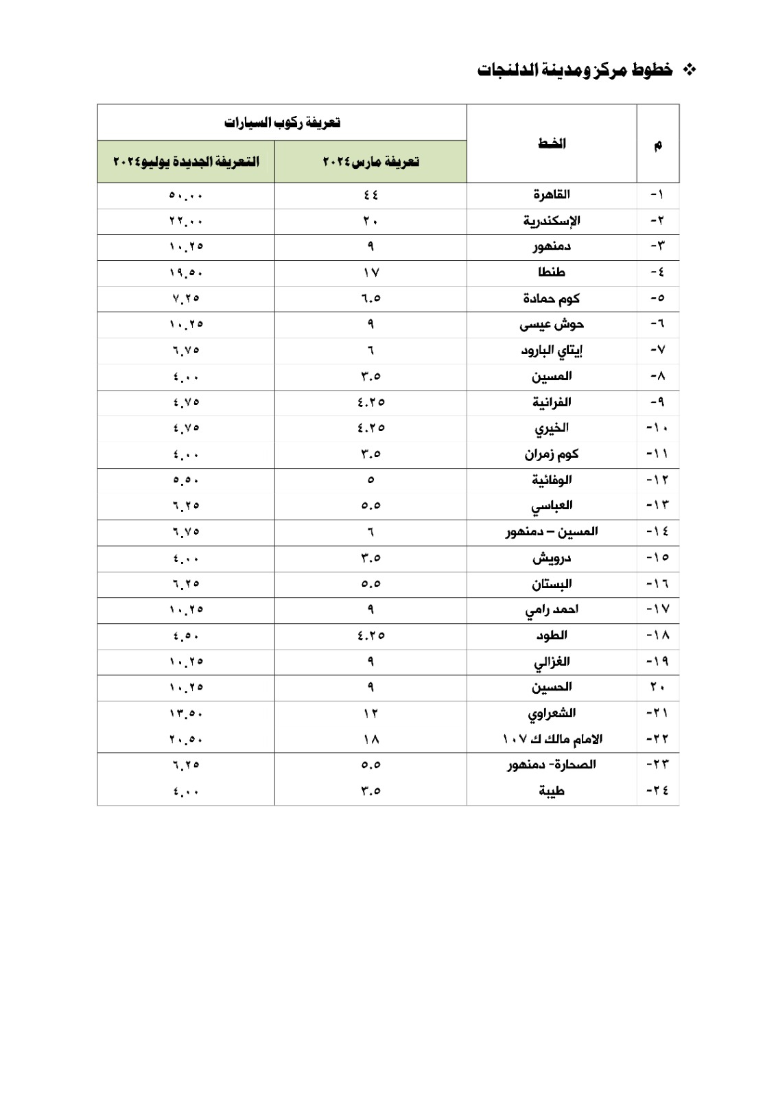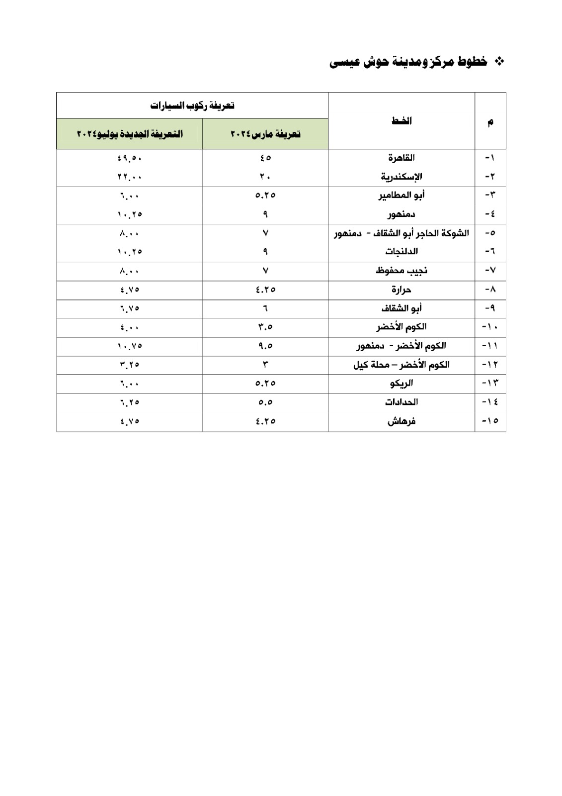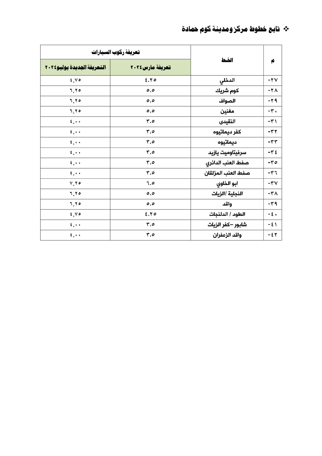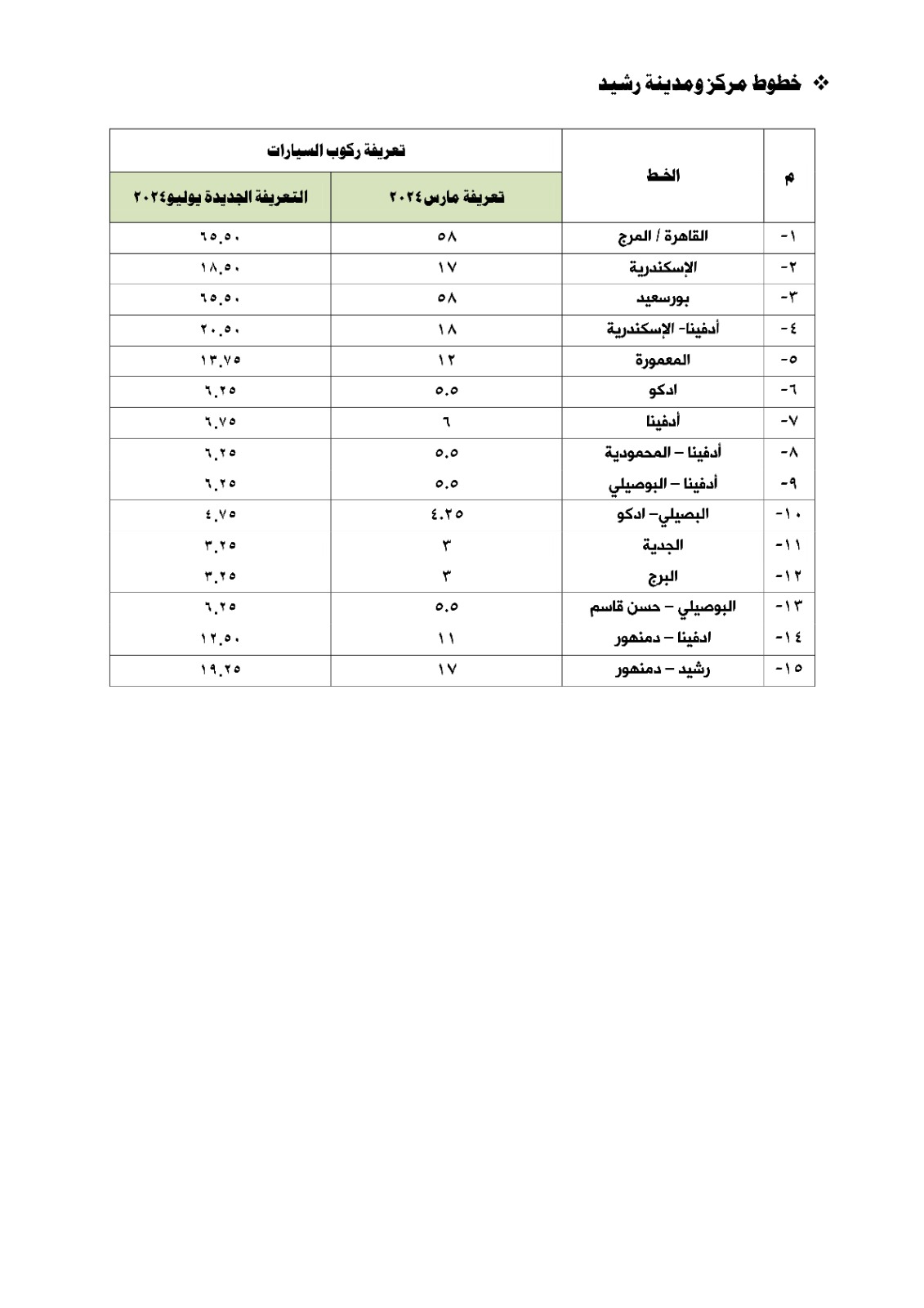 - قيمة تذكرة مركبات مشروع النقل الداخلي من 3,50 جنيه لتصبح 4 جنيهات.