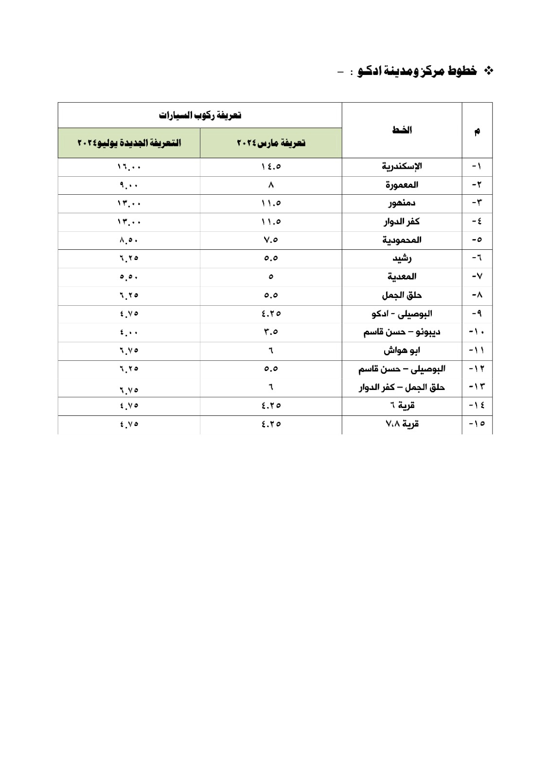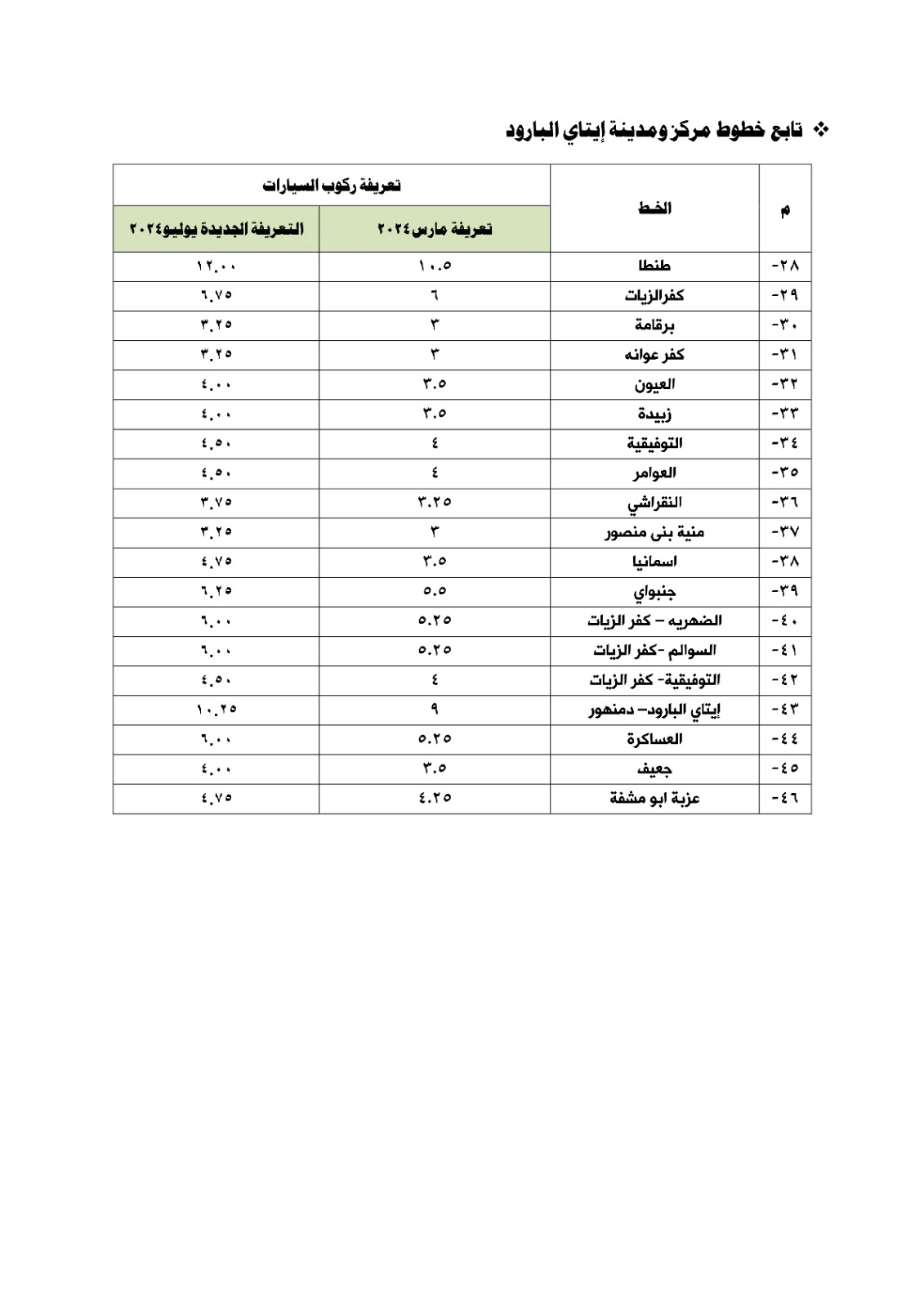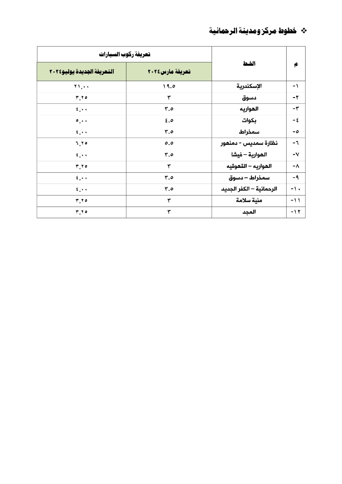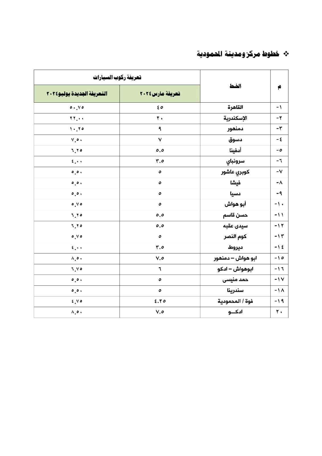 - قيمة تذكرة مركبات مشروع النقل الداخلي من 3,50 جنيه لتصبح 4 جنيهات.