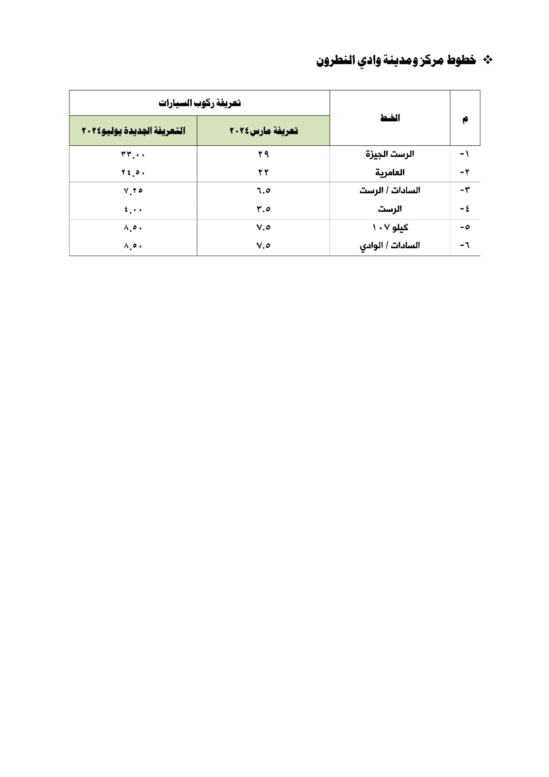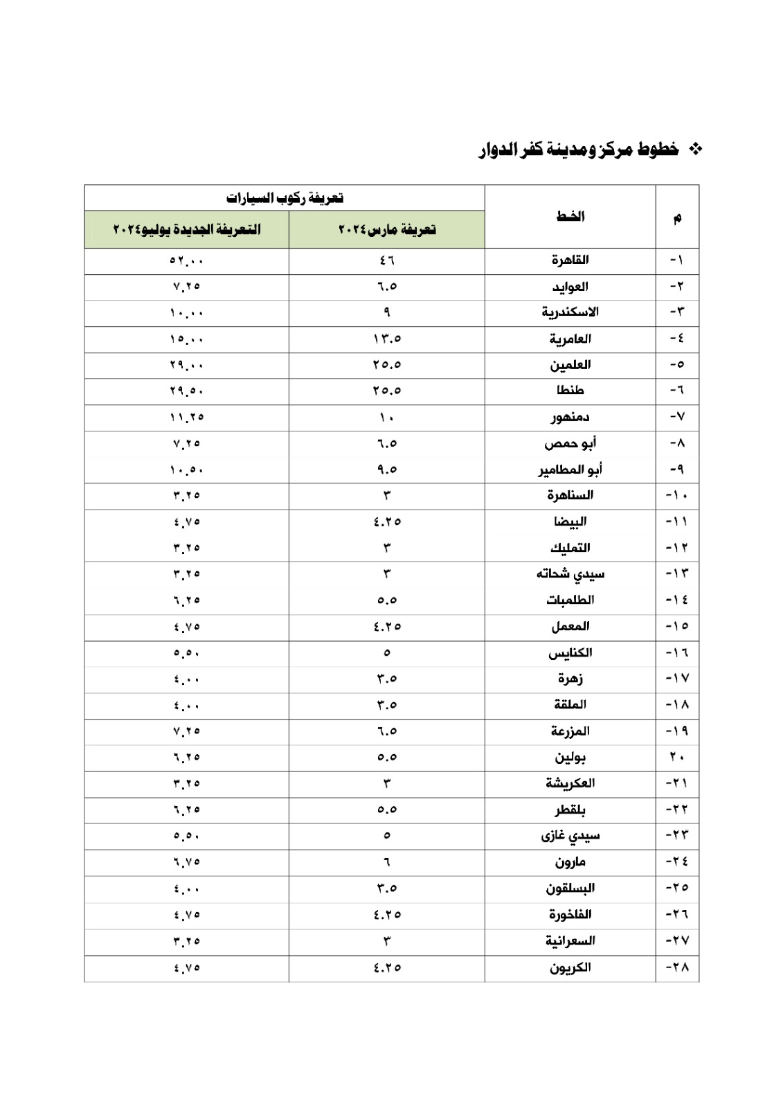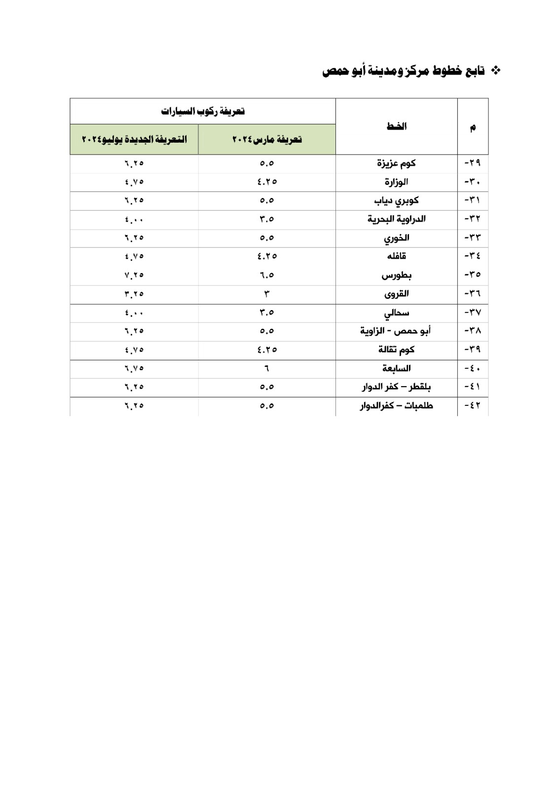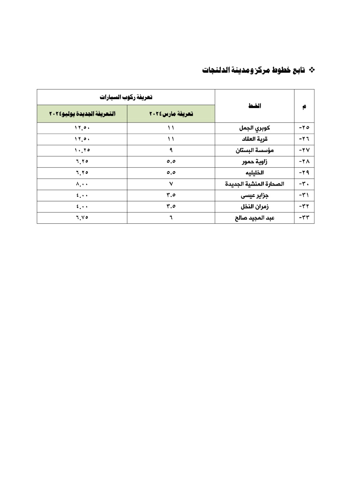 - قيمة تذكرة مركبات مشروع النقل الداخلي من 3,50 جنيه لتصبح 4 جنيهات.