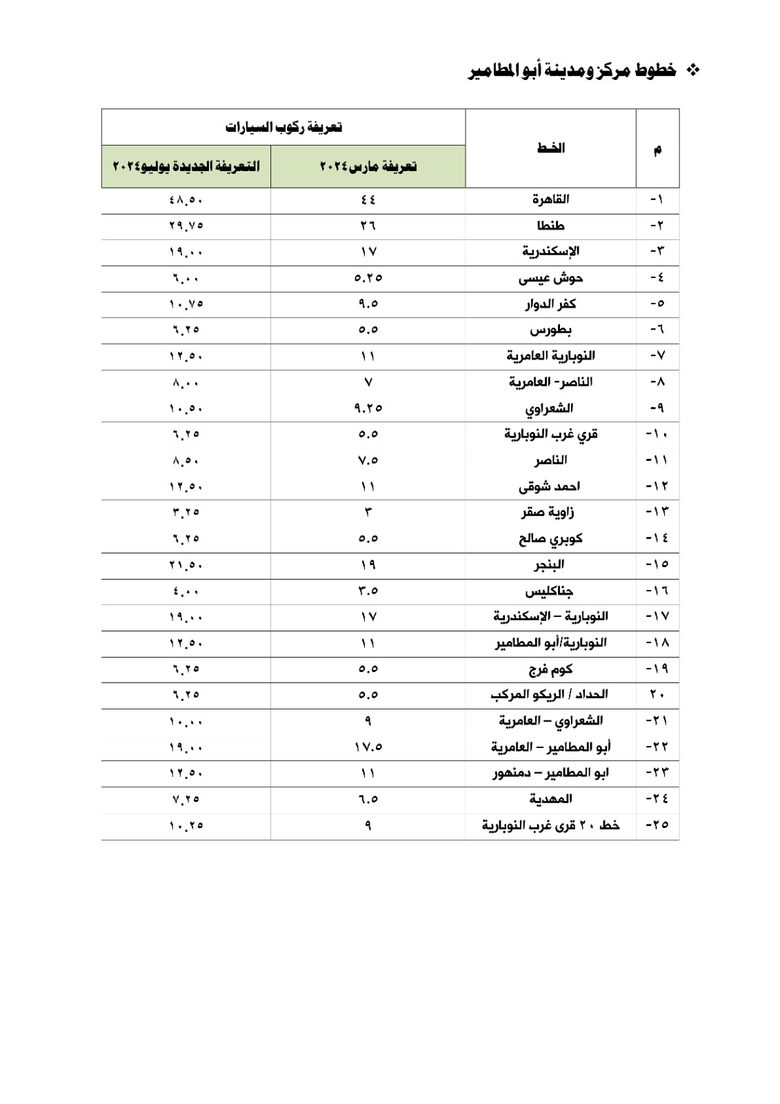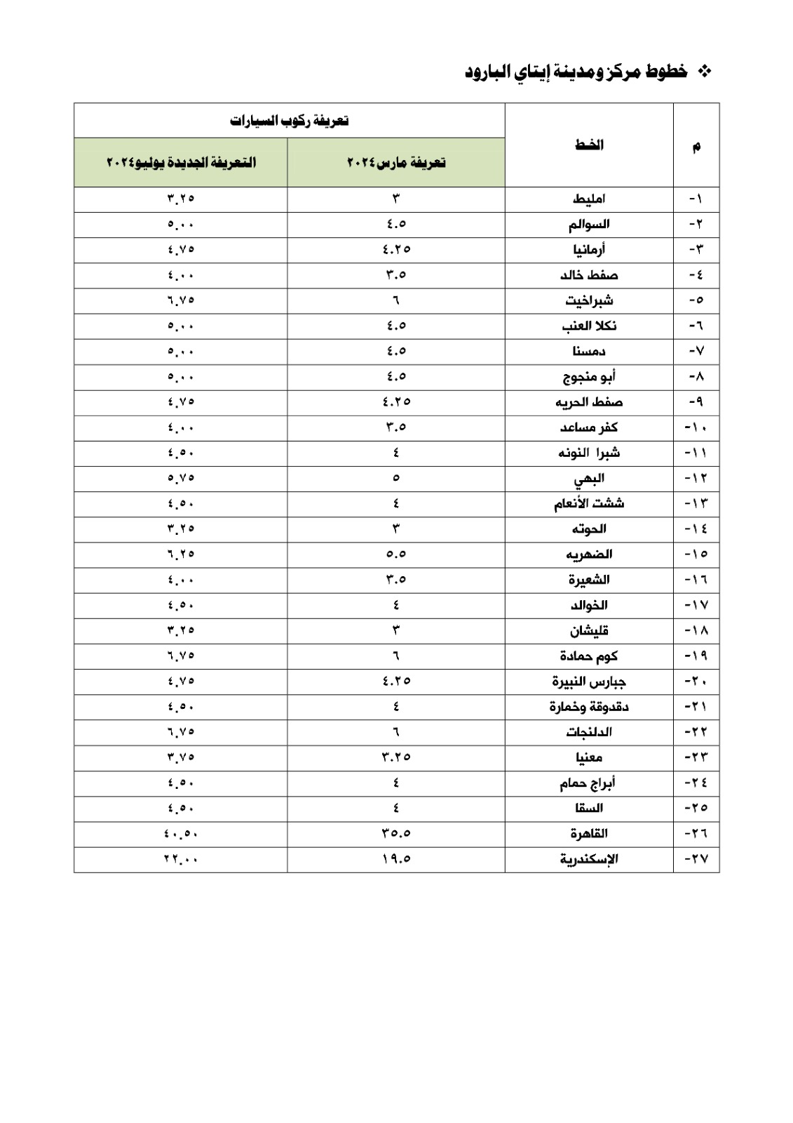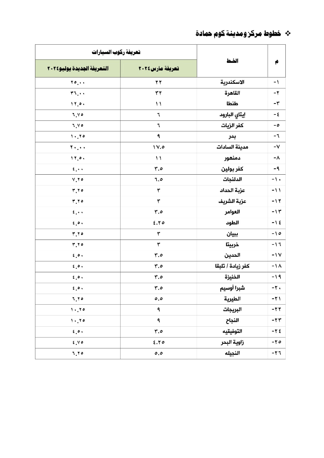 حيث تم زيادة تعريفة ركوب السيارات الأجرة العاملة على الخطوط (الداخلية والخارجية) بين مراكز المحافظة بعضها البعض وبينها وبين المحافظات الأخرى وتُزاد تعريفة ركوب السيارات والمركبات المبينة على النحو التالى:-