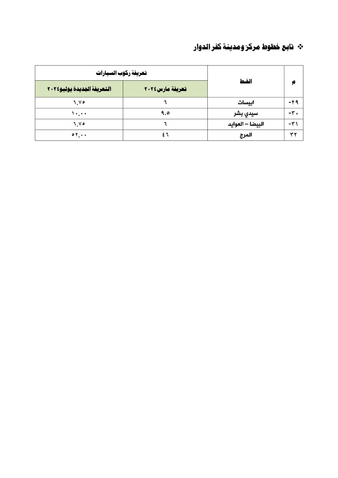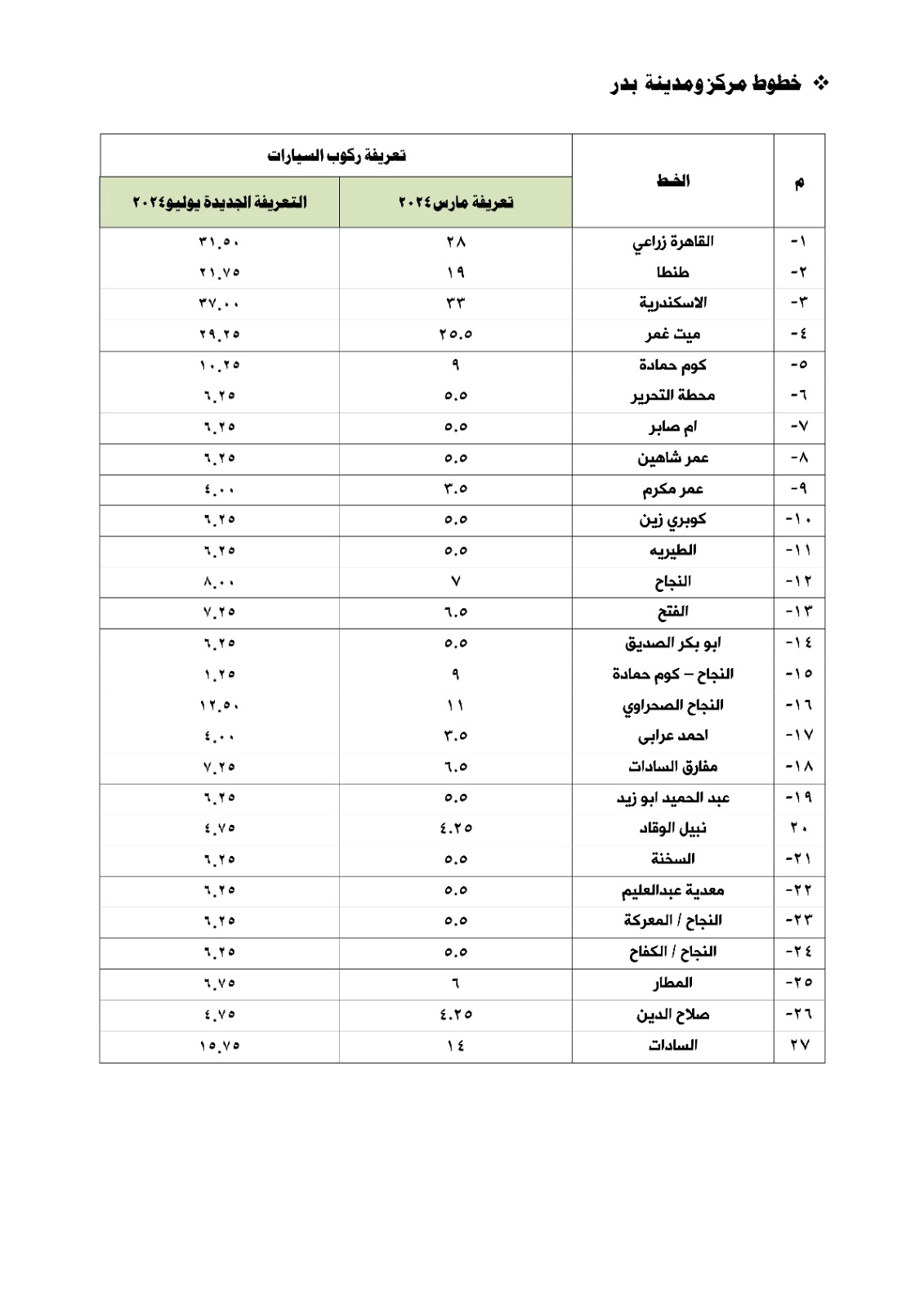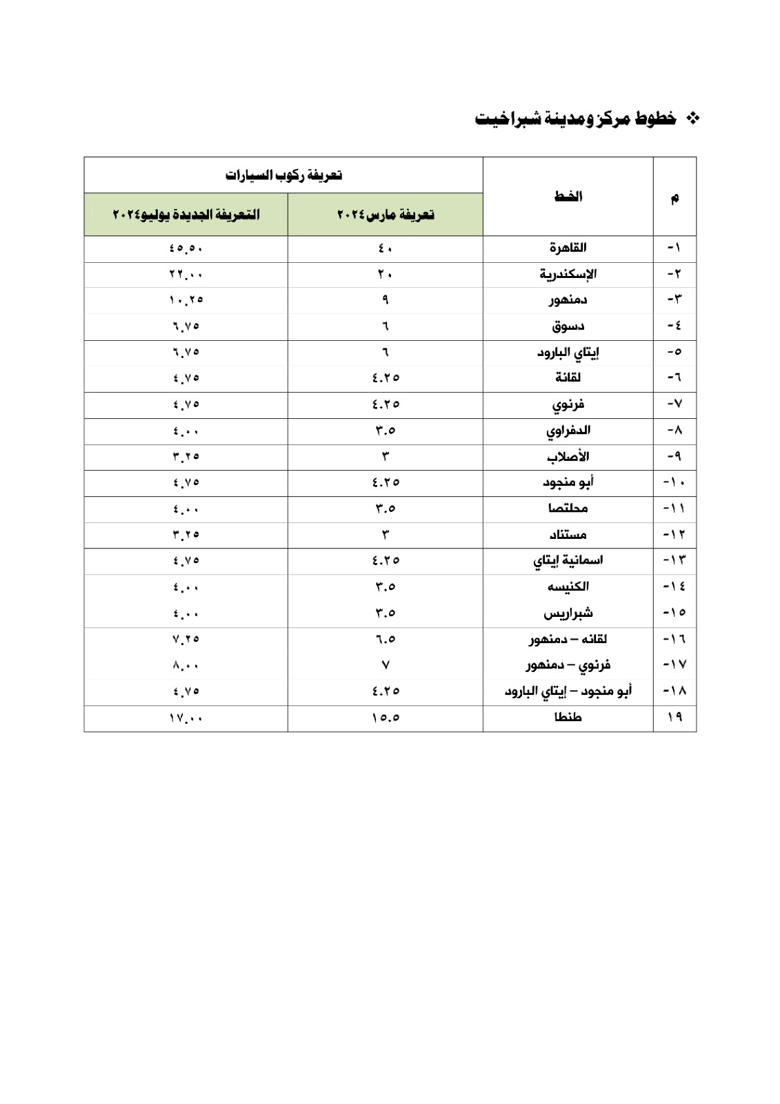 حيث تم زيادة تعريفة ركوب السيارات الأجرة العاملة على الخطوط (الداخلية والخارجية) بين مراكز المحافظة بعضها البعض وبينها وبين المحافظات الأخرى وتُزاد تعريفة ركوب السيارات والمركبات المبينة على النحو التالى:-