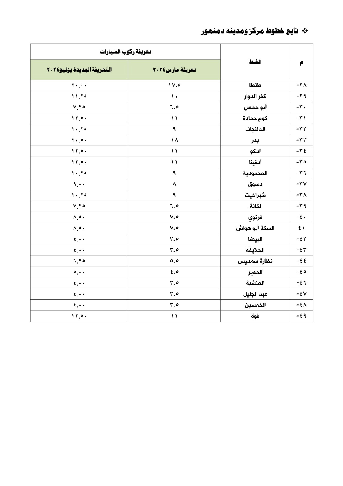 كما تكلف الوحدات المحلية لمراكز ومدن المحافظة تنسيقا مع إدارة مرور البحيرة ومباحث المرور وإدارة مشروع المواقف بالعمل على إلزام سائقى السيارات والمركبات المشار إليها بالمادة الأولى بتعريفة الركوب المقررة، على أن يتم الإعلان عن التعريفة فى مكان واضح بجميع مواقف السيارات بدائرة المحافظة وتشديد الرقابة للالتزام بها، وكذا الإلتزام بعدد الركاب المقرر وخطوط السير المرخص بها لكل سيارة أو مركبة.