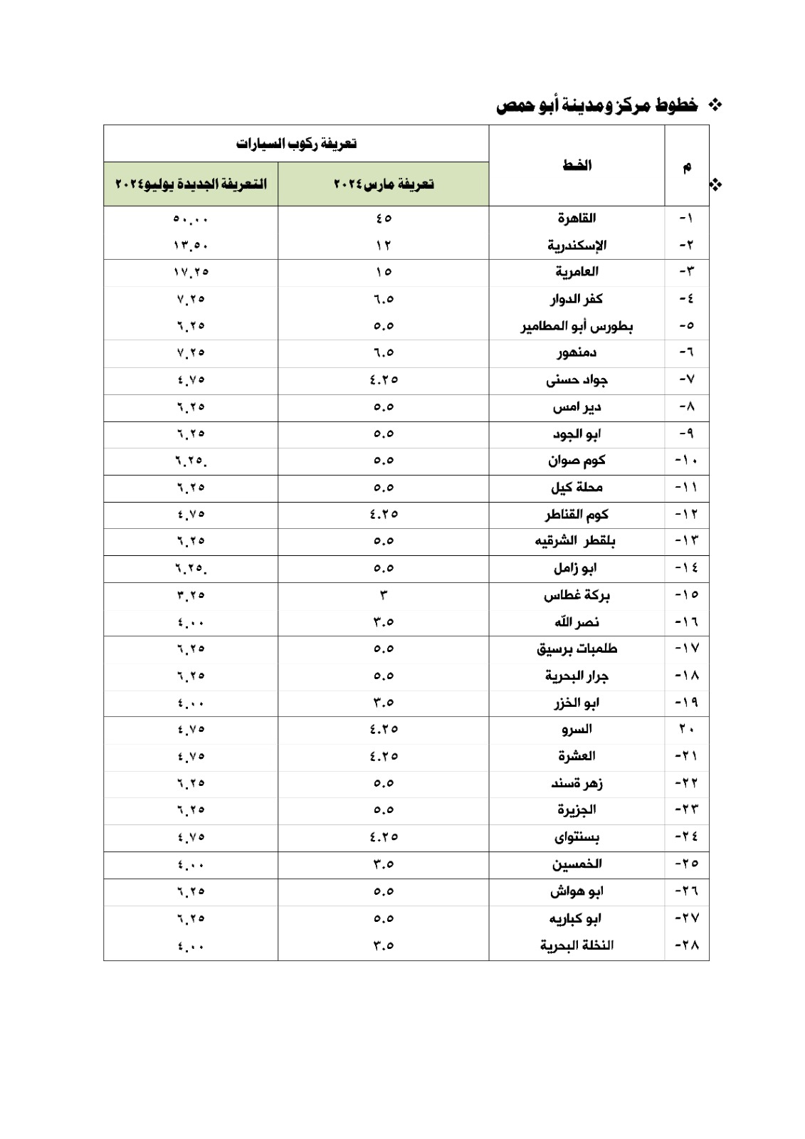 - سيارات الأجرة السرفيس من 3 جنيه لتصبح 3.50 جنيه.