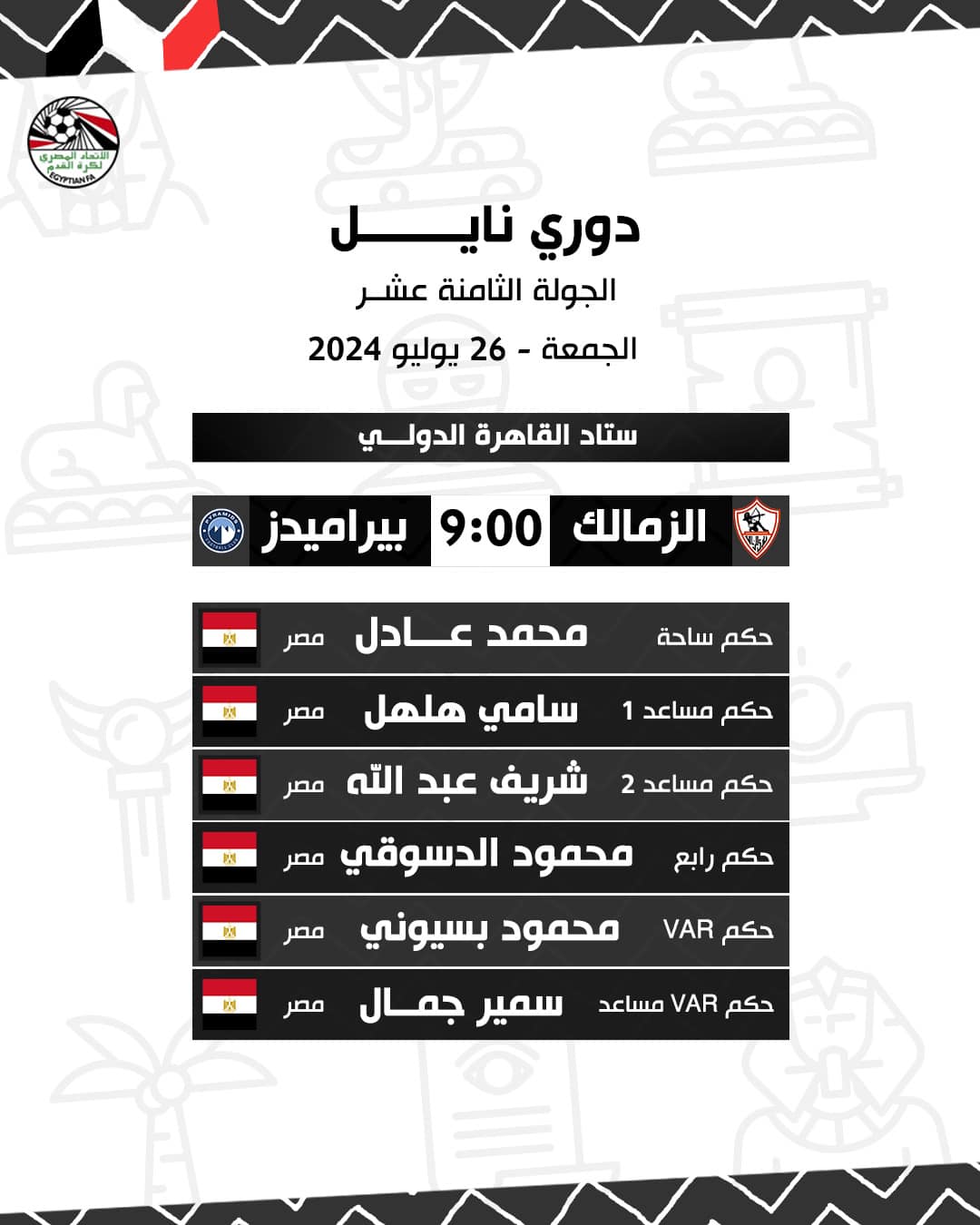 أعلنت لجنة الحكام باتحاد الكرة، عن طاقم حكام مباراتي الدوري المصري الممتاز، غدا الجمعة، بين الأهلي والمصري على استاد برج العرب، والزمالك أمام بيراميدز باستاد القاهرة.