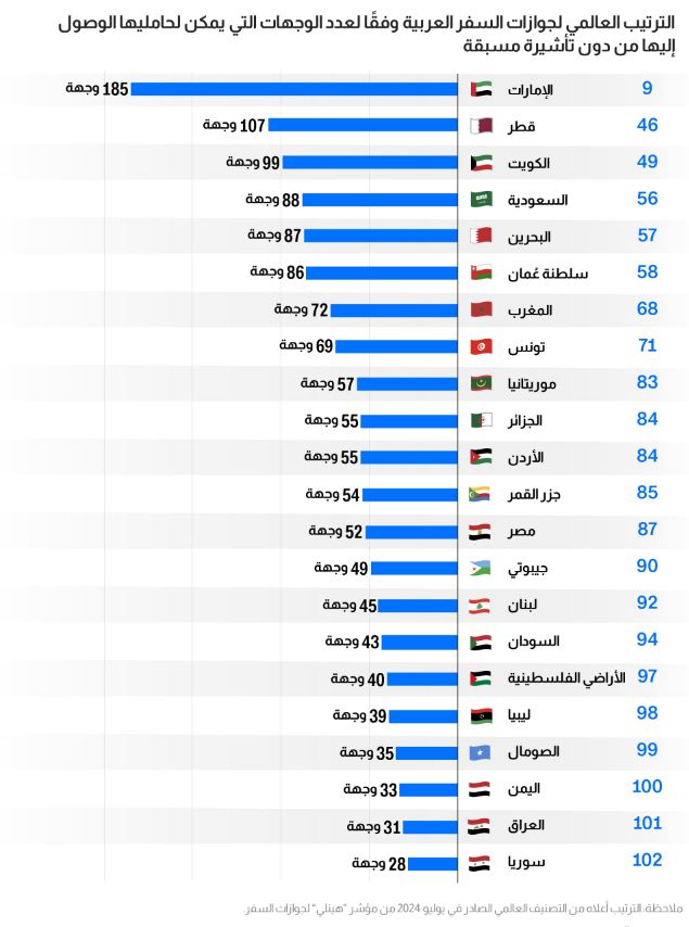 وعلى مدى السنوات الـ 19 الماضية، قام مؤشر "هينلي" لجوازات السفر، الذي أنشأته شركة استشارات الجنسية والإقامة العالمية "Henley & Partners"، مقرها لندن، بتتبع حريات السفر العالمية في 227 دولة ومنطقة من حول العالم، باستخدام بيانات حصرية من الاتحاد الدولي للنقل الجوي.
