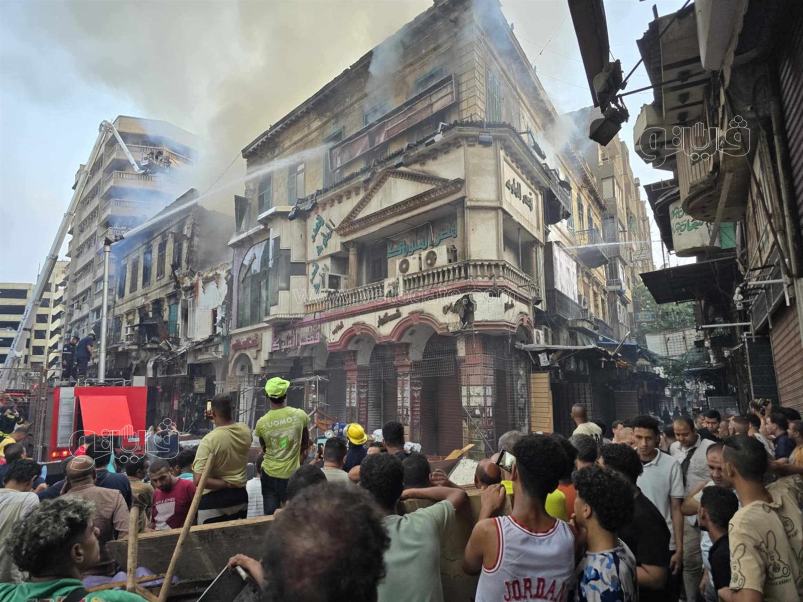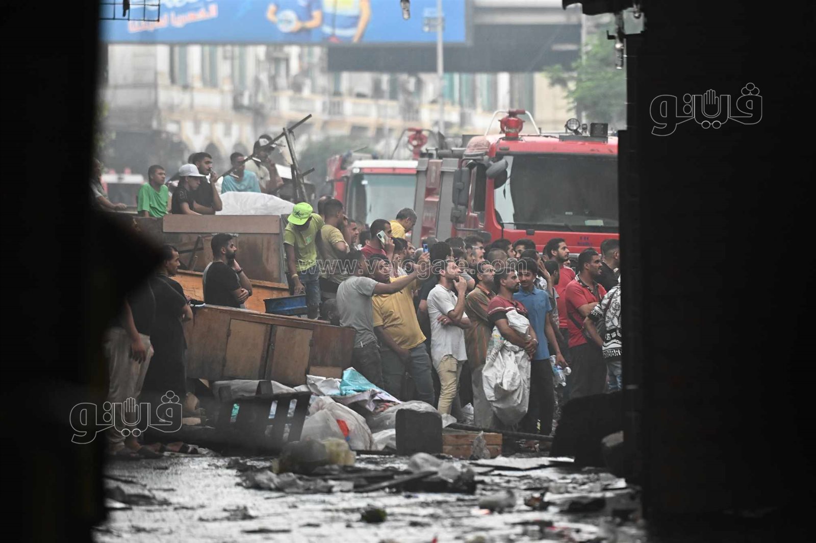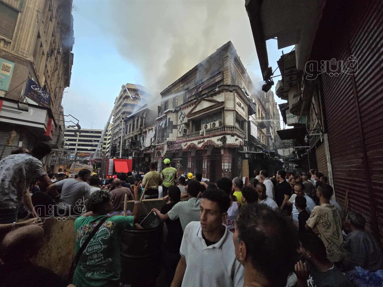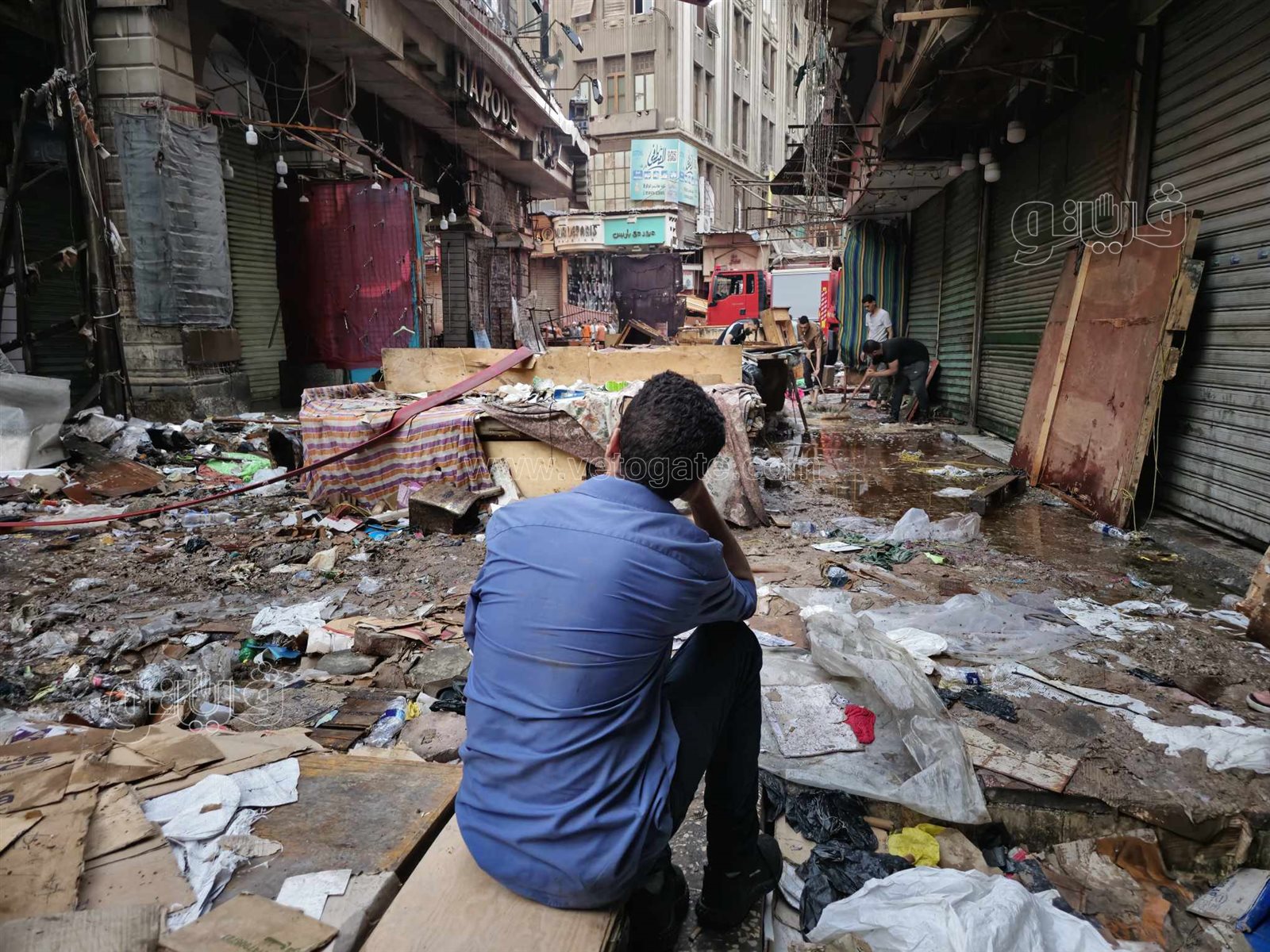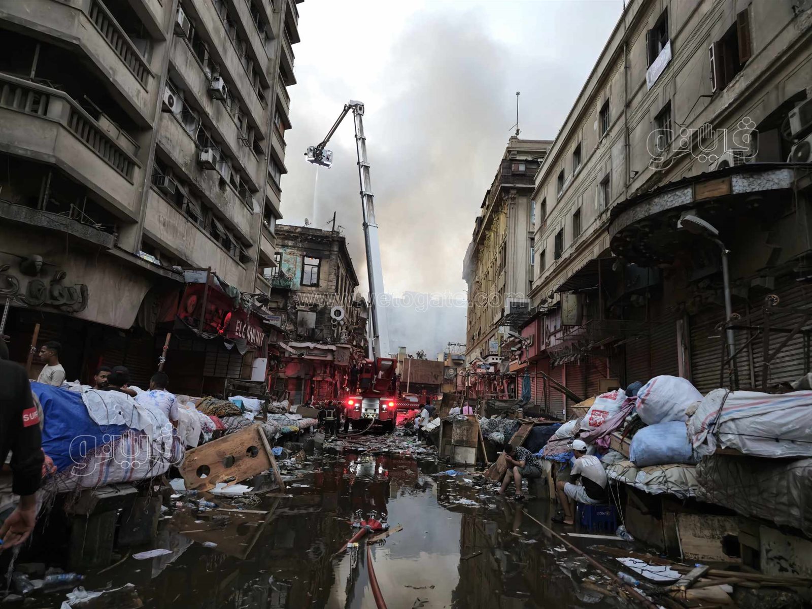 شارع مدمر وأياد على الخدود، آثار حريق مخازن الملابس والأجهزة بالعتبة (فيديو وصور)