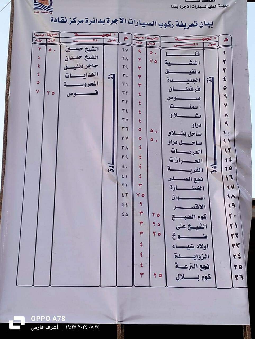 وطالب بوضع الملصقات على سيارات الأجرة في موقف نقادة - قنا وذلك لتوعية ومعرفة المواطنين بالتعريفة الجديدة وفي حالة عدم التزام اصحاب السيارات بالتعريفة المقررة سوف يتم اتخاذ الإجراءات القانونية حيال المخالفين.