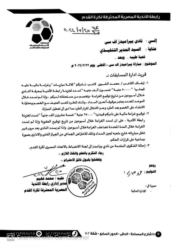 3- إحالة الشكوى المقدمة من نادي بيراميدز إلى لجنة الانضباط بالاتحاد المصري لكرة القدم.