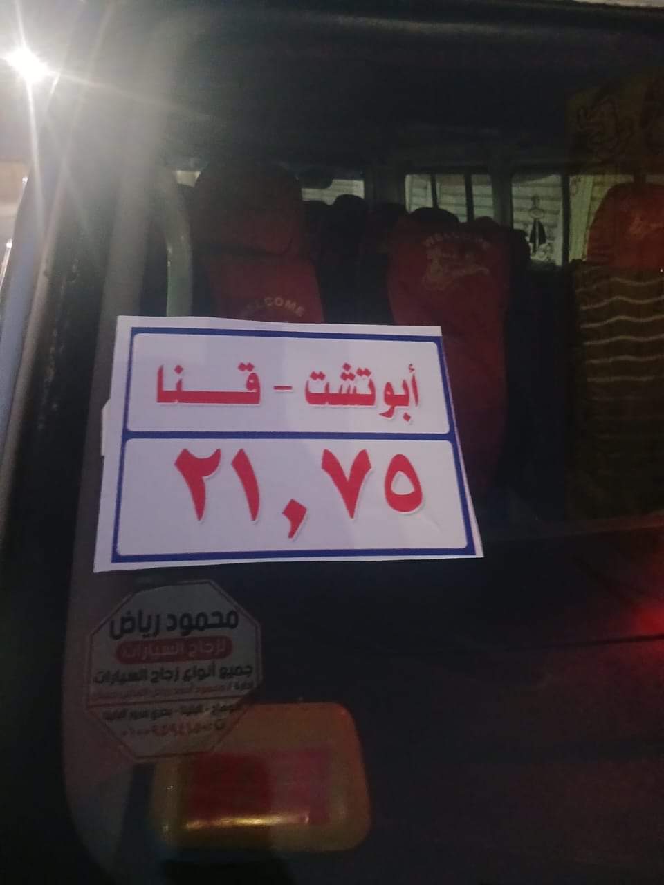 ووجه مدير المواقف بوضع اللوحات الإرشادية والملصقات المدون عليها التعريفة الجديدة داخل الموقف في أماكن ظاهرة لتعريف المواطنين بالأسعار الجديدة، تنفيذا لتوجيهات الدكتور خالد عبدالحليم محافظ قنا، منعًا لاستغلال المواطنين، مع إلزام السائقين بوضع ملصقات بقيمة التعريفة الجديدة.