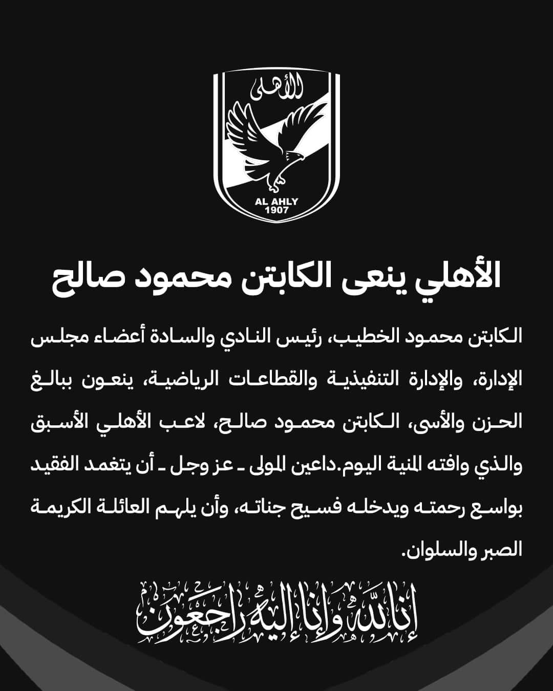 كتب الأهلي في بيانه: ينعي محمود الخطيب، رئيس النادي والسادة أعضاء مجلس الإدارة، والإدارة التنفيذية والقطاعات الرياضية، ببالغ الحزن والأسى، محمود صالح، داعين المولى ــ عز وجل ــ أن يتغمد الفقيد بواسع رحمته ويدخله فسيح جناته، وأن يلهم العائلة الكريمة الصبر والسلوان. «إِنَّا للهِ وَإِنَّا إِلَيْهِ رَاجِعُونَ»