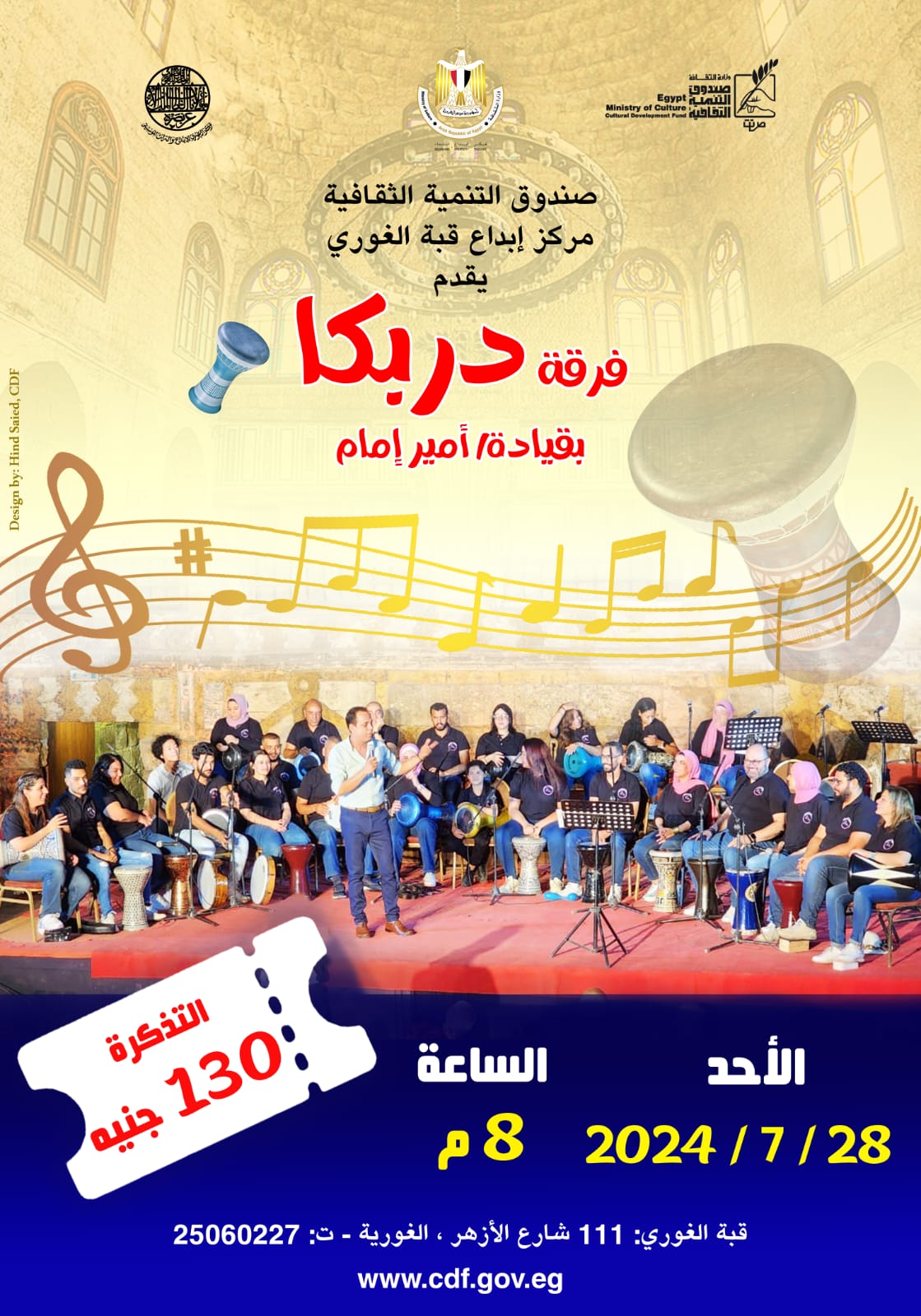 ينظم مركز إبداع قبة الغوري بشارع الأزهر، التابع لقطاع صندوق التنمية الثقافية برئاسة الدكتور وليد قانوش، حفلًا فنيًا لفرقة "دربكا" بقيادة الفنان أمير إمام، وذلك في الثامنة مساء غد الموافق الأحد 28 يوليو.