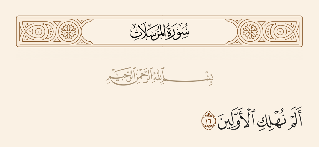 قال تعالى: «أَلَمْ نُهْلِكِ الْأَوَّلِينَ (١٦) ثُمَّ نُتْبِعُهُمُ الْآخِرِينَ (١٧) كَذلِكَ نَفْعَلُ بِالْمُجْرِمِينَ (١٨) وَيْلٌ يَوْمَئِذٍ لِلْمُكَذِّبِينَ (١٩)».