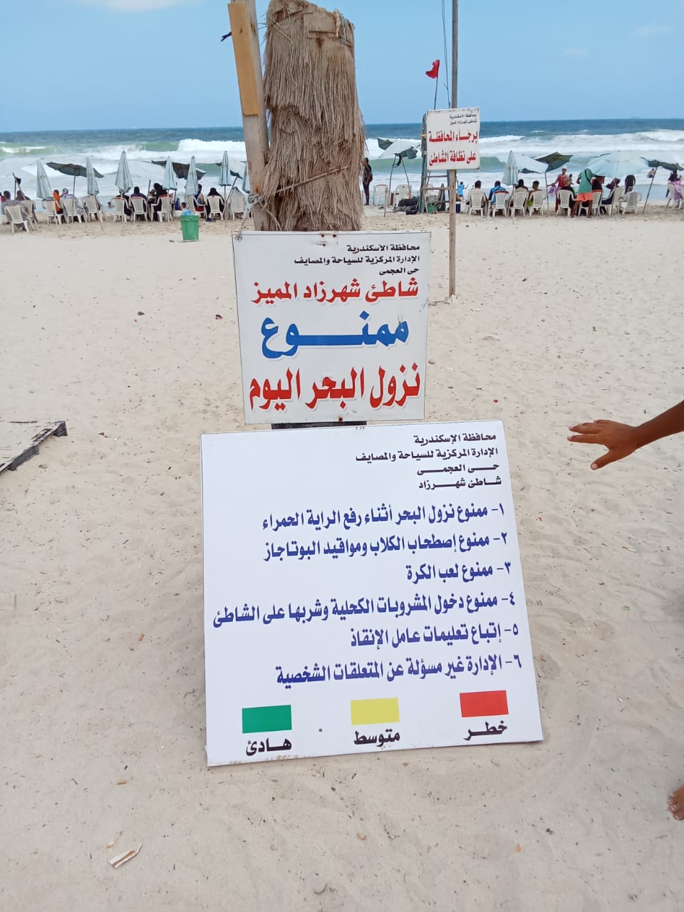 وما تم عرضه على الفريق محافظ الإسكندرية، ورفع الراية الحمراء فى شواطئ العجمى والقطاع الغربي فقط ومنع نزول الرواد لمياه البحر حفاظا على أرواح المواطنين مع استمرار فتح جميع الشواطئ أمام الرواد للجلوس على الرمال فقط والاستمتاع بمياه البحر والاسترخاء بالقطاع الغربى فقط