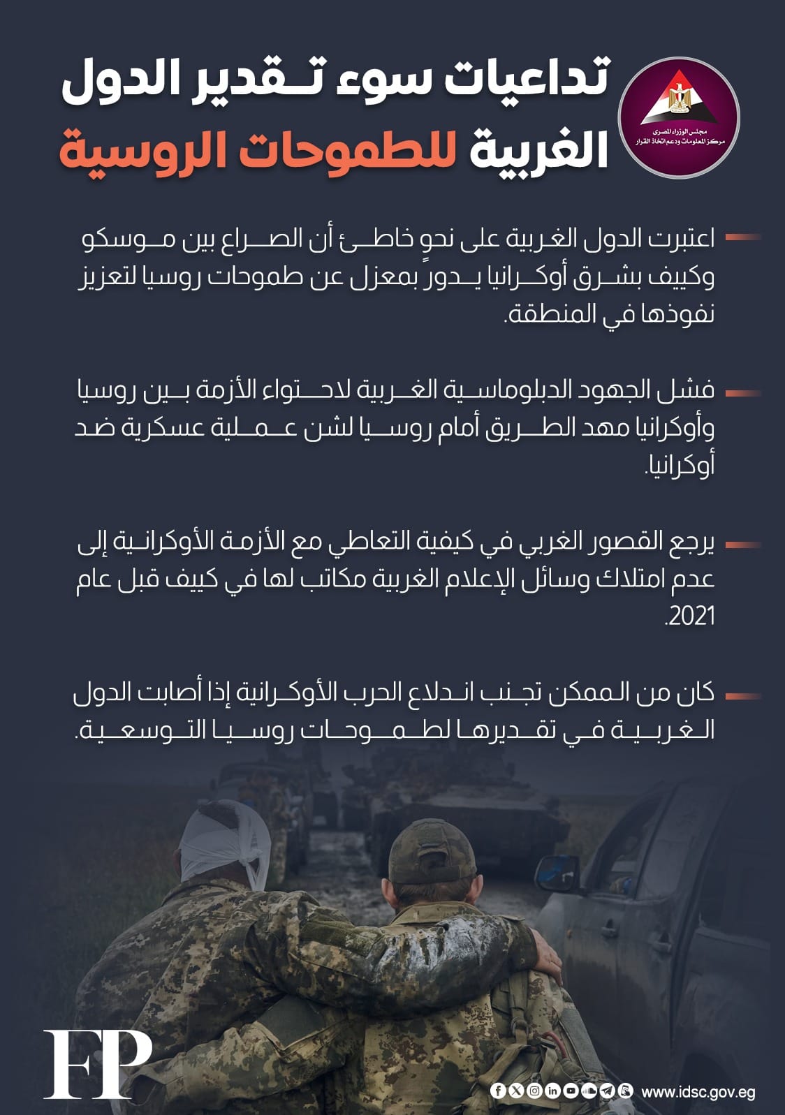 سلط مركز المعلومات ودعم اتخاذ القرار بمجلس الوزراء الضوء على مقال نشرته "فورين بوليسي" حول مساعي روسيا لفرض رؤيتها الأمنية الخاصة على الدول الغربية بشتَى الطرق، مع لفت الانتباه إلى أن الدول الغربية لم تأخذ طموحات روسيا التوسعية على محمل الجد حتى وقتٍ قريب.