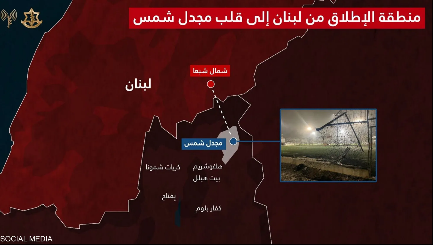 وفي وقت سابق من مساء أمس السبت، نشر أدرعي صورة قال إنها توضح مسار الصاروخ الذي سقط في مجدل شمس، مضيفا: "من تحليل الأنظمة العملياتية في جيش الدفاع يتبين أن إطلاق القذيفة الصاروخية باتجاه وسط مجدل شمس تم من منطقة تقع شمال قرية شبعا في جنوب لبنان. وفقا للمعلومات الاستخباراتية الموثوقة التي يمتلكها جيش الدفاع فإن حزب الله الإرهابي يقف وراء عملية الإطلاق".