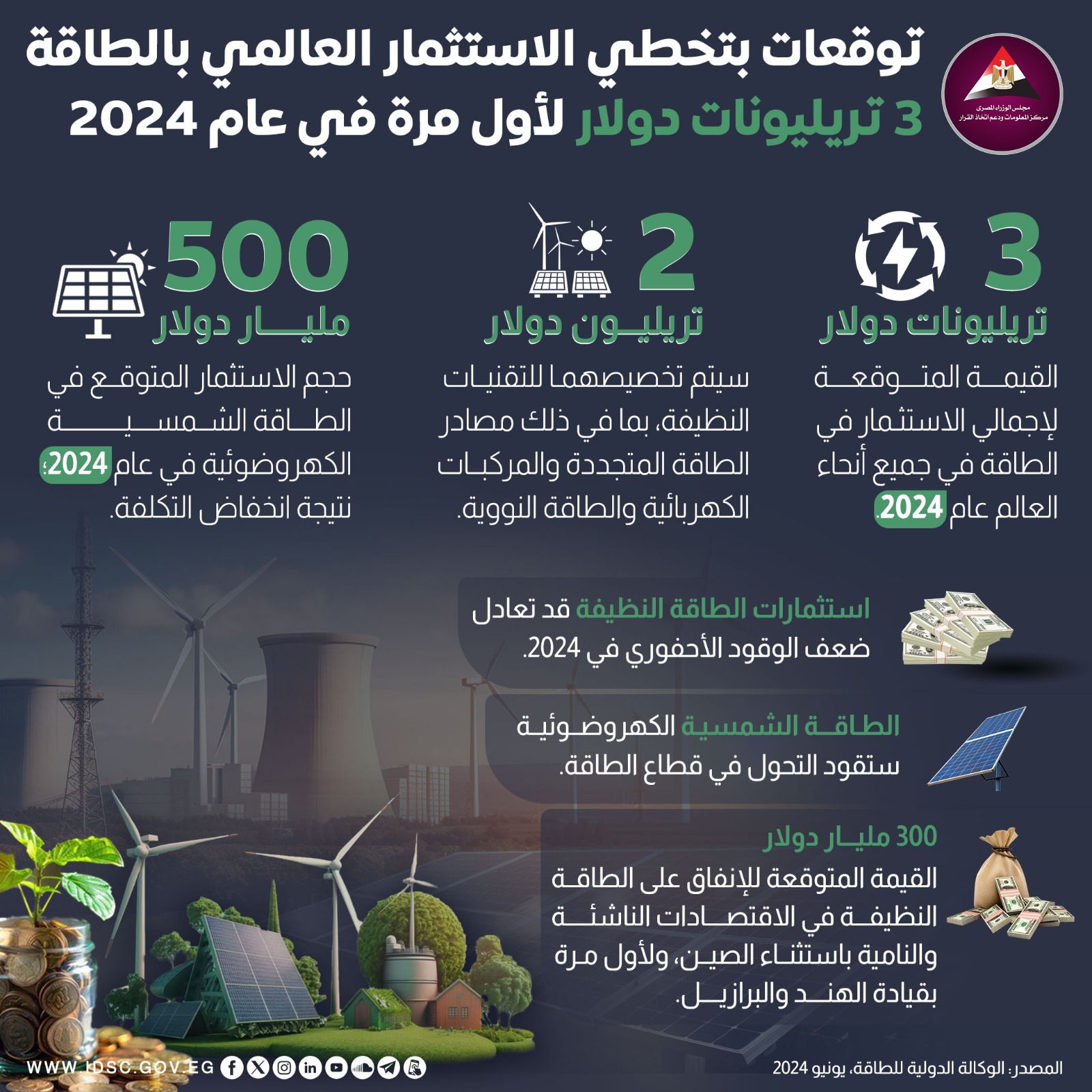 كشف مركز المعلومات ودعم اتخاذ القرار بمجلس الوزراء عن توقعات بتخطي الاستثمار العالمي بالطاقة لحاجز الـ 3 تريليونات دولار لأول مرة في عام 2024.