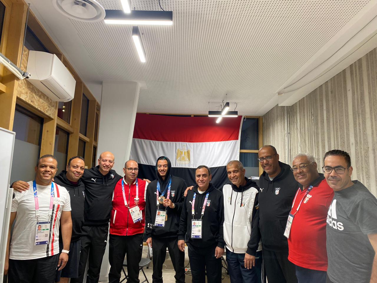 أولمبياد باريس، البعثة المصرية تحتفل ببرونزية محمد السيد داخل القرية الأولمبية