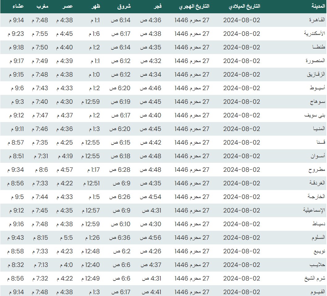 مواقيت الصلاة اليوم وفقًا للتوقيت المحلي لمدينتي القاهرة والإسكندرية وكذلك،مواقيت الصلاة، لعدد من مدن ومحافظات الجمهورية من واقع بيانات الهيئة العامة للمساحة