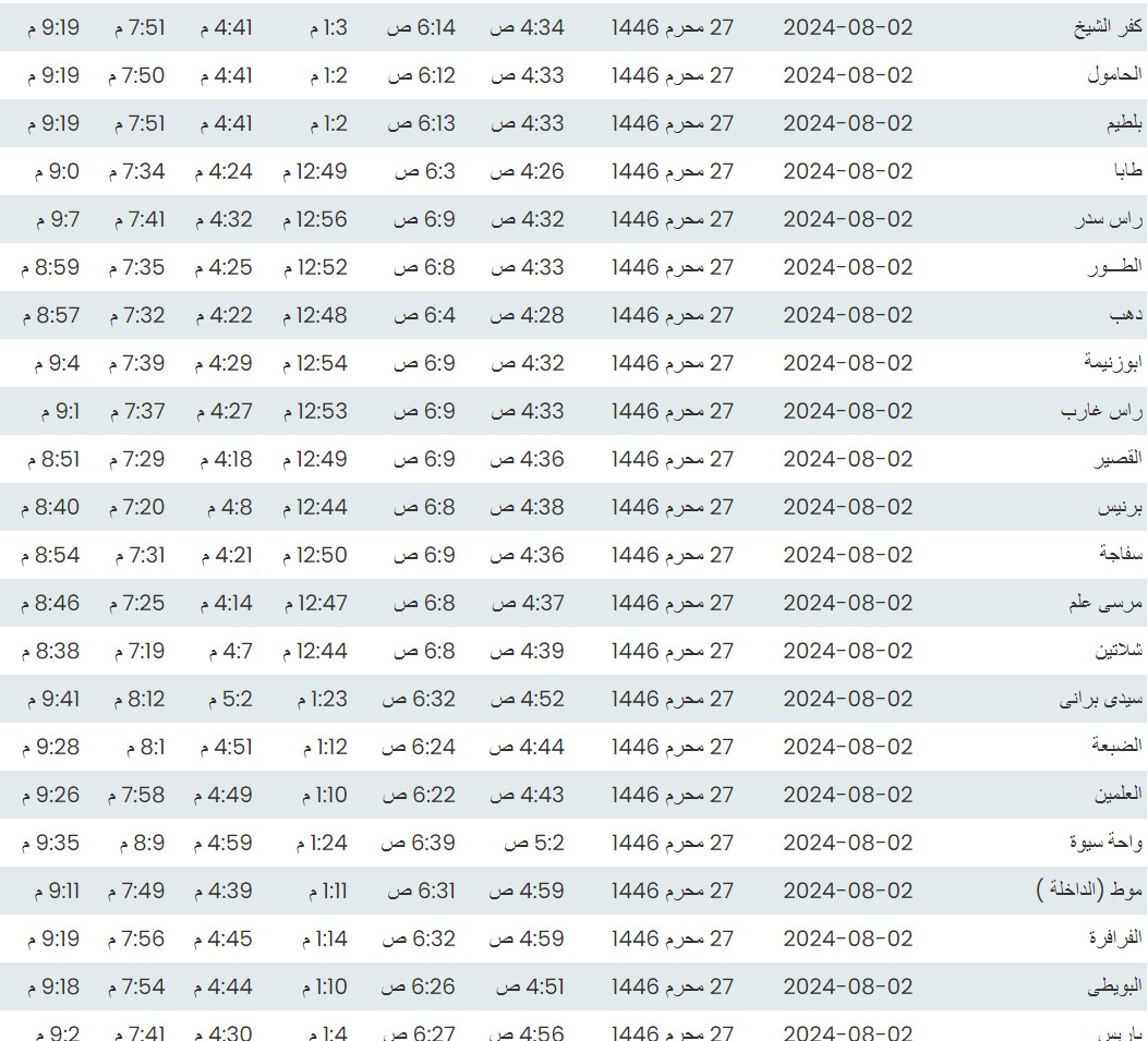 وفيما يلي مواقيت الصلاة، لعدد من مدن ومحافظات الجمهورية من واقع بيانات الهيئة العامة للمساحة