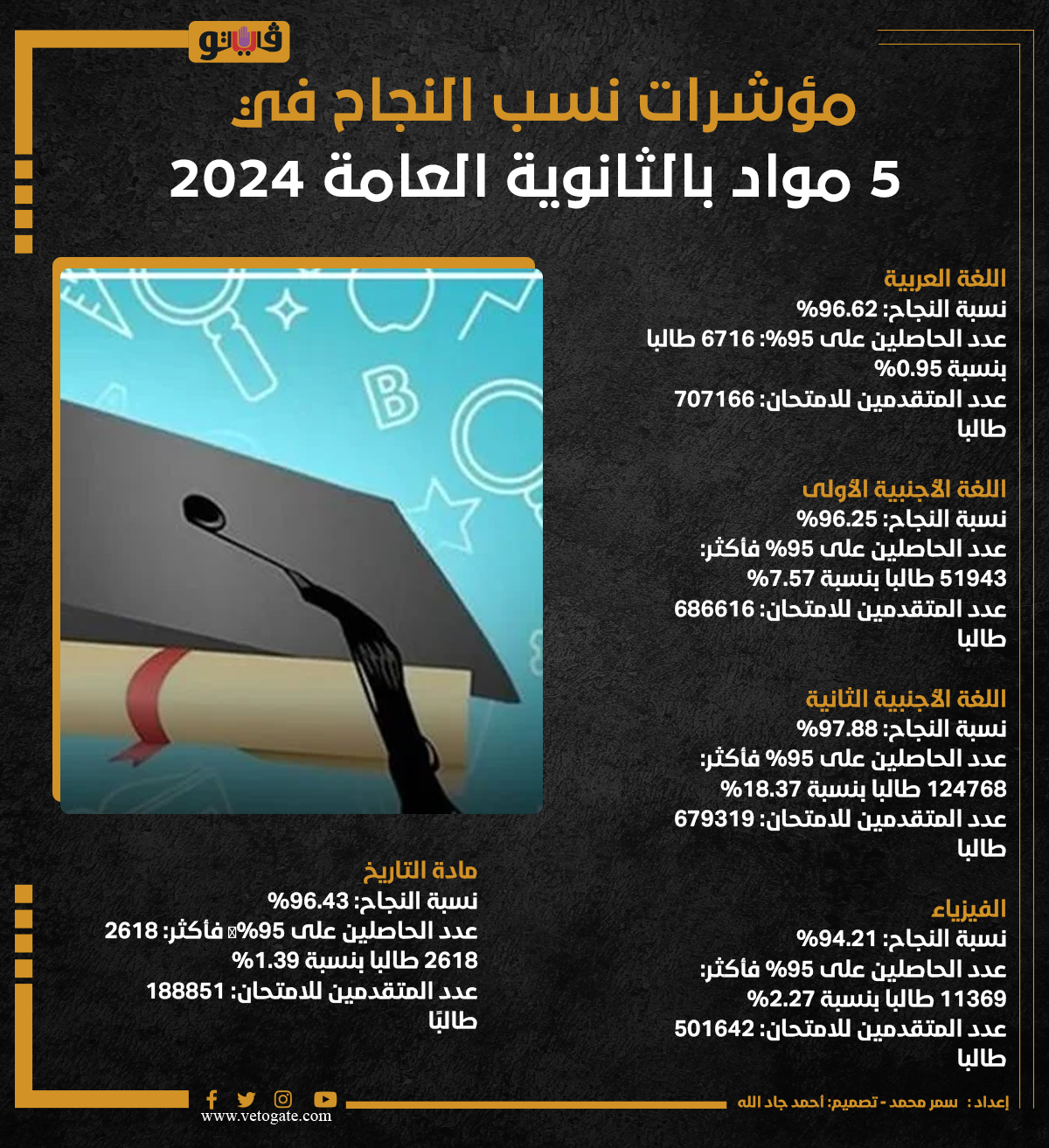 وبلغت نسبة النجاح في امتحان مادة اللغة العربية ٩٦.٦٢٪، وبلغ عدد الطلاب الحاصلين على نسبة ٩٥% فأكثر من الدرجة الكلية ٦٧١٦ طالبا وطالبة بنسبة ٠.٩٥ % من إجمالي عدد الطلاب المتقدمين للامتحان البالغ ٧٠٧١٦٦ طالبا وطالبة.