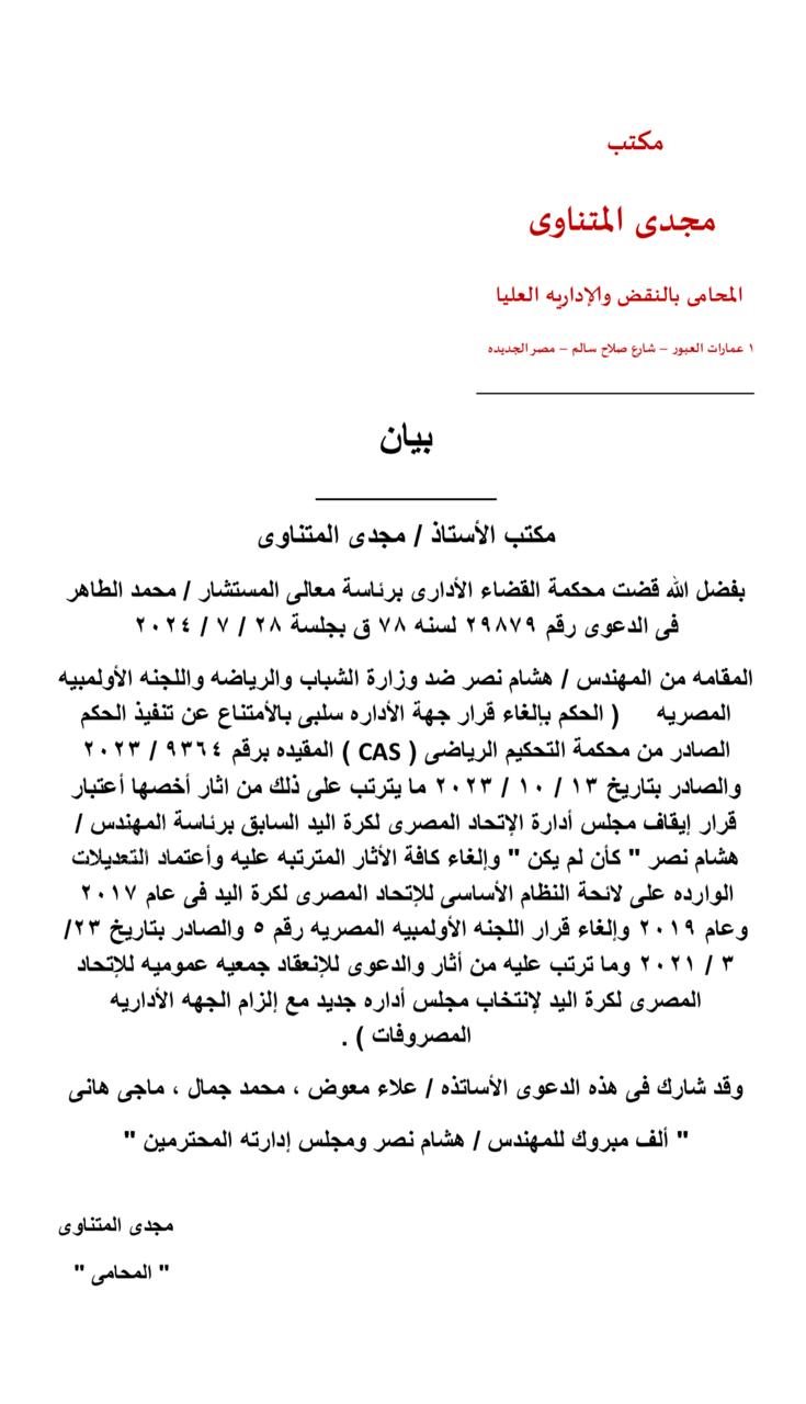 أعلن مجدي المتناوي عضو مجلس إدارة اتحاد الكرة المصري السابق، ومحامي هشام نصر نائب رئيس مجلس إدارة الزمالك، رئيس الاتحاد المصري لكرة اليد السابق، أن محكمة القضاء الإداري قضت بإلغاء قرار إيقاف مجلس إدارة اتحاد كرة اليد برئاسة المهندس هشام نصر واعتبار القرار كأن لم يكن، وإلغاء ما يترتب عليه من آثار، واعتماد التعديلات الواردة على لائحة النظام الأساسي لعام 2019.