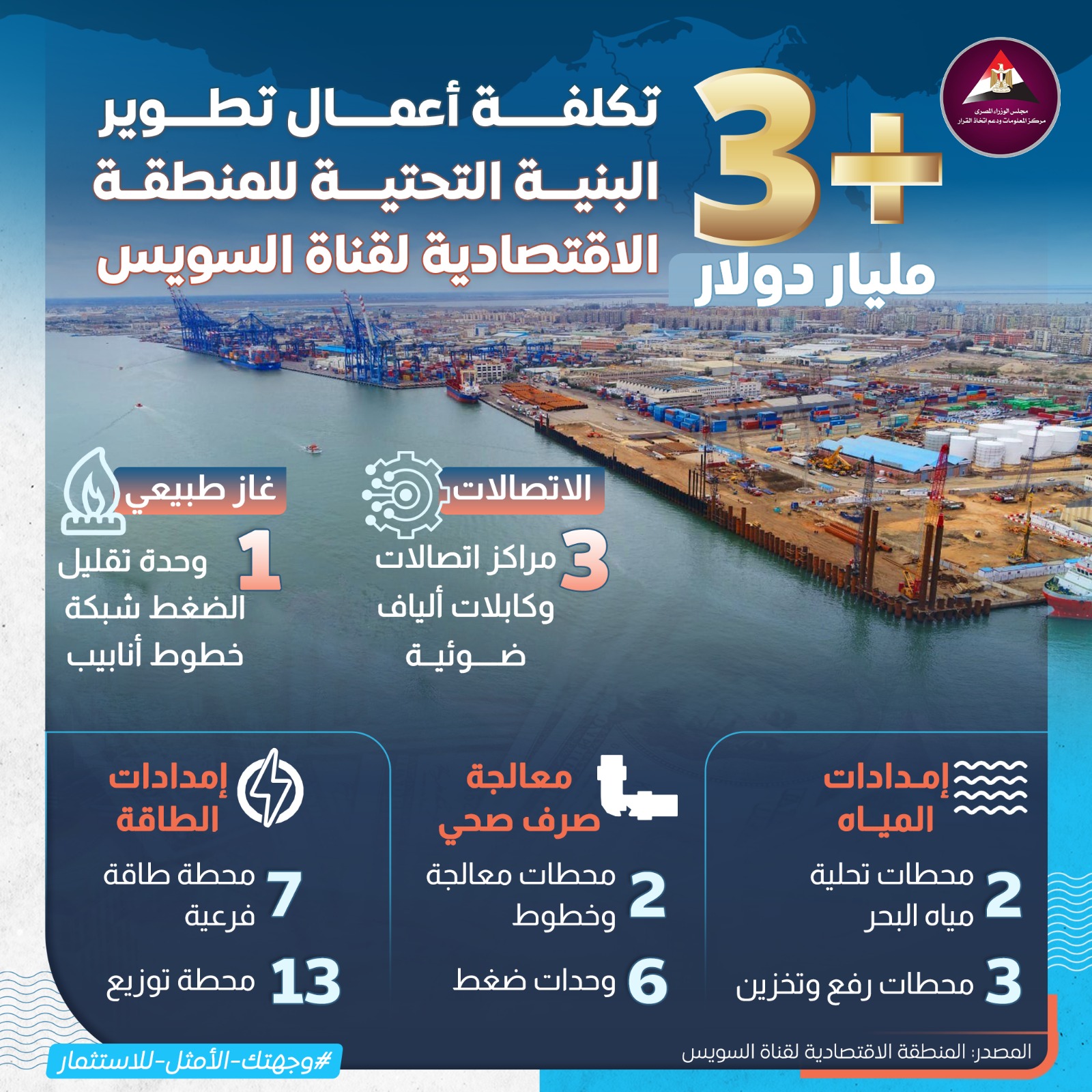 كشف مركز المعلومات ودعم اتخاذ القرار بمجلس الوزراء عن تكلفة أعمال تطوير البنية التحتية للمنطقة الاقتصادية لقناة السويس حيث بلغت القيمة الإجمالية 3 مليارات دولار.