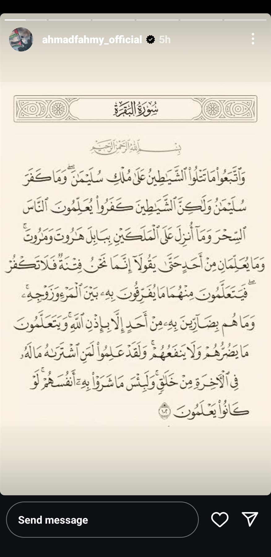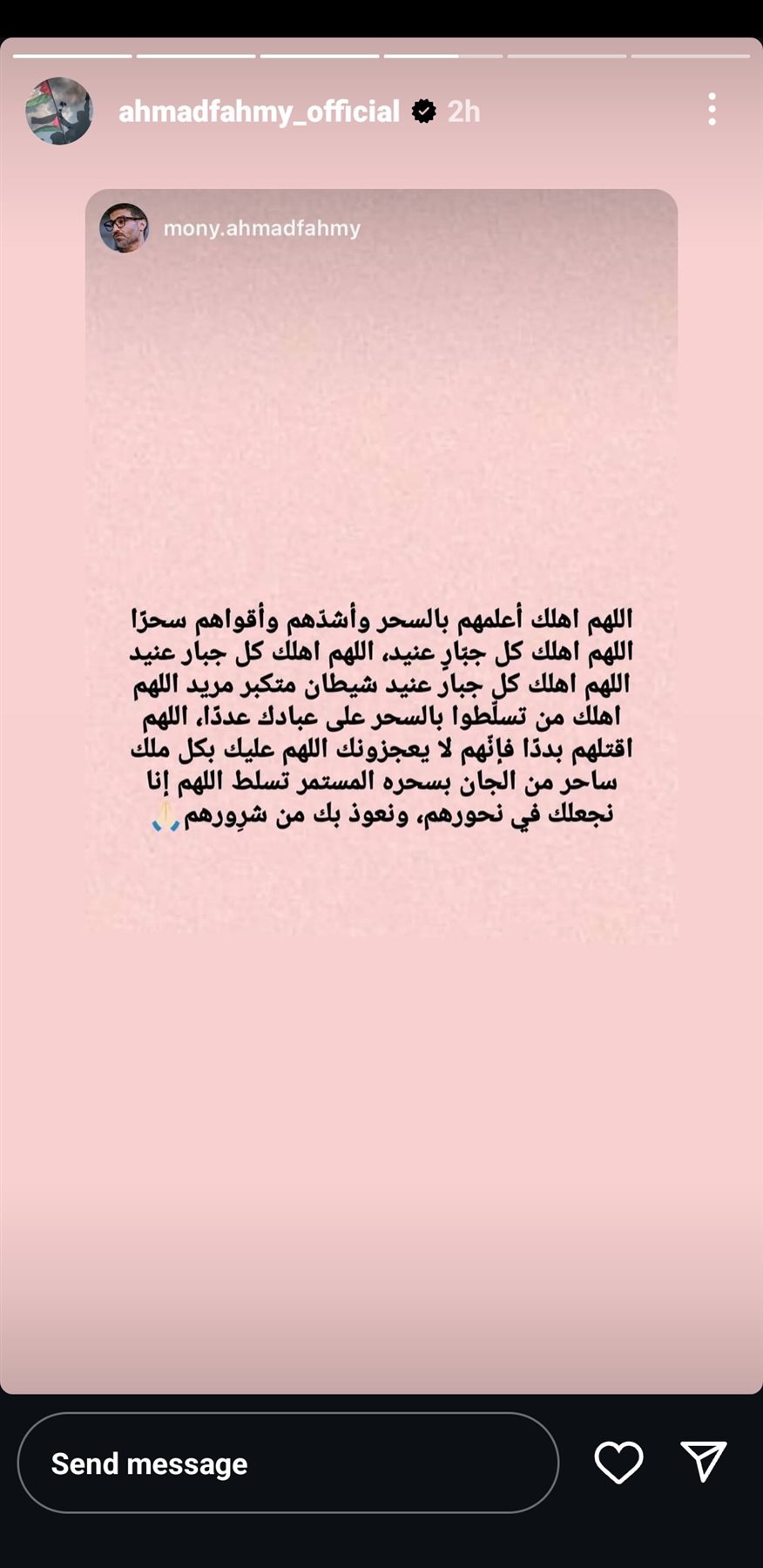 والجدير بالذكر أنه قبل هذه الرسالة شارك أحمد فهمي عدد من الآيات القرآنية والادعية الخاصة بالسحر عبر خاصية "الستوري" على الانستجرام، والذي جعل معجبيه في حالة من الفضول عن من يقصد بهذه الرسائل.
