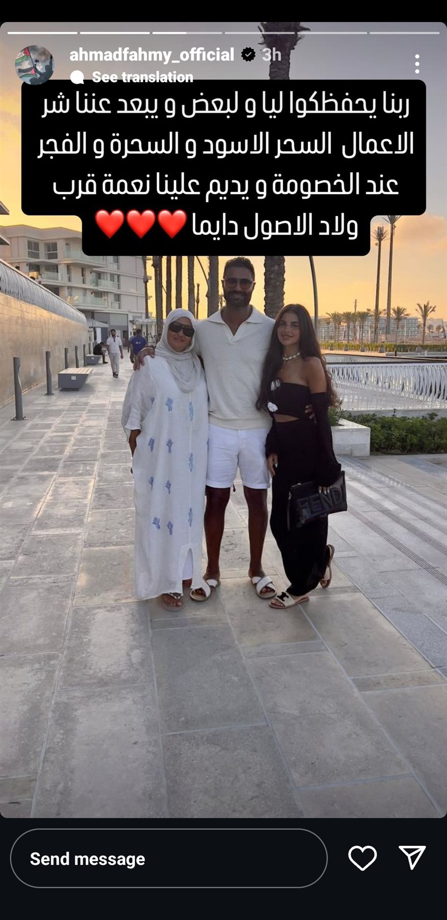 وشارك أحمد فهمي صورة لشقيقه كريم وزوجته ووالدتهم، وكتب عليها: “ربنا يحفظكوا ليا ولبعض، ويبعد عننا شر الأعمال والسحر الأسود والسحرة والفجر عند الخصومة، ويديم علينا نعمة قرب ولاد الأصول دايما”.