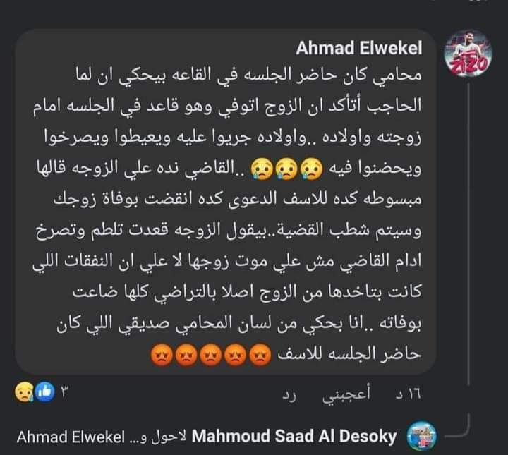 وجاءت التعليقات من شهود العيان الذين حضروا الواقعة، حيث قال محامي إنه عندما تأكد الحاجب من موت الزوج وهو جالس على المقعد داخل قاعة الجلسة، بعدما لم يرد عند نداء الحاجب عليه، فهرول أولاده عليه بالصراخ، بينما قام القاضي بالنداء على طليقته وأخبرها بشطب الدعوى بوفاة الزوج، فقامت بالصراخ، وحينما سألها الموجودون عن سر صراخها قالت إنه ليس على زوجها وإنما على النفقة التي كانت تأخذها منه بالتراضي وطمعت في زيادتها، الأمر الذي لم يتحمله الزوج وتسبب في إصابته بسكتة قلبية أدت إلى وفاته.