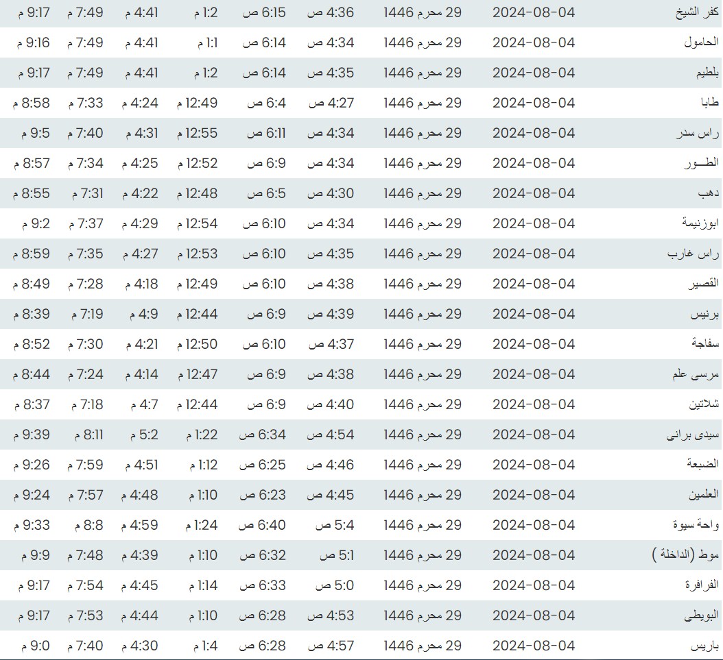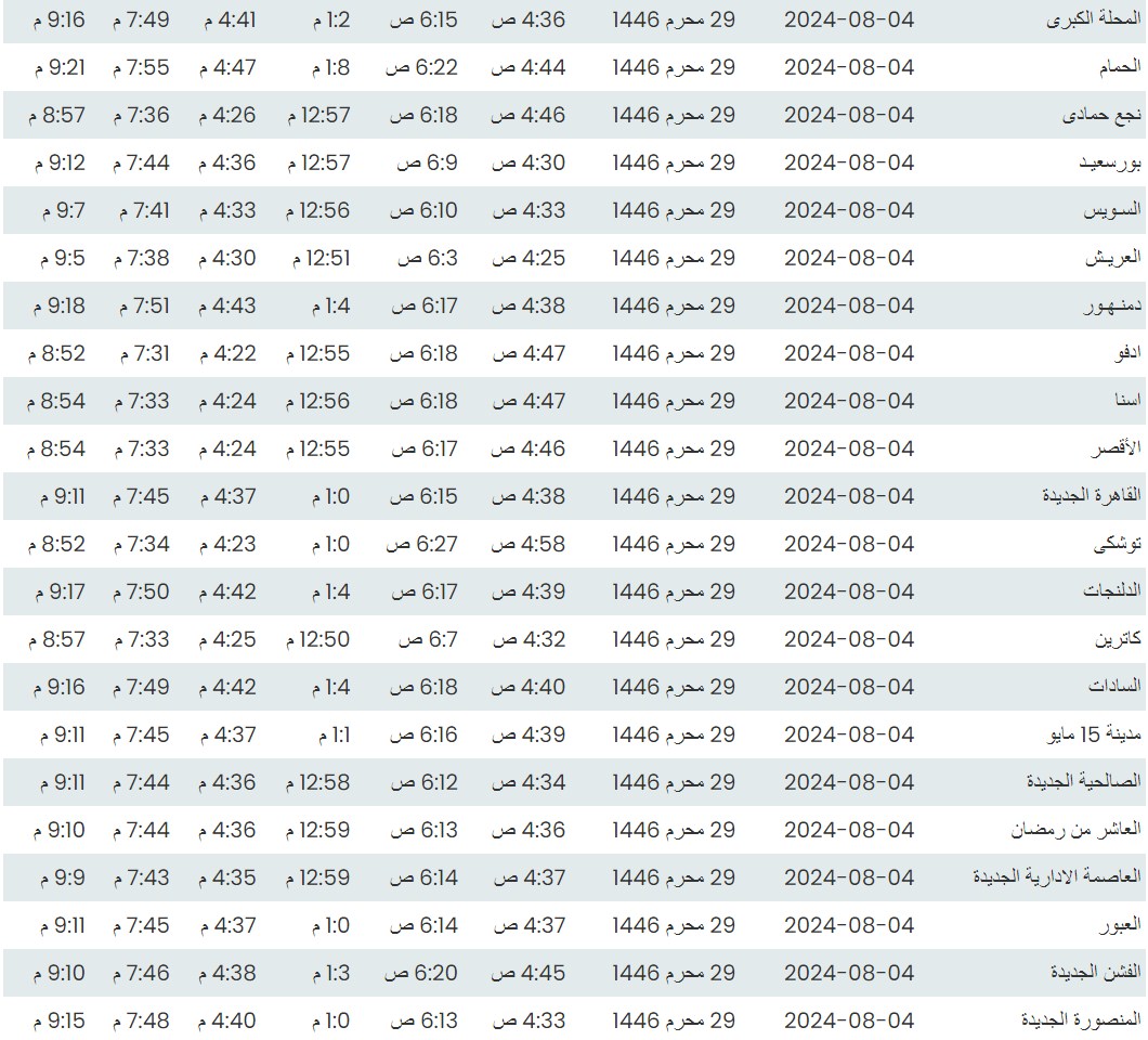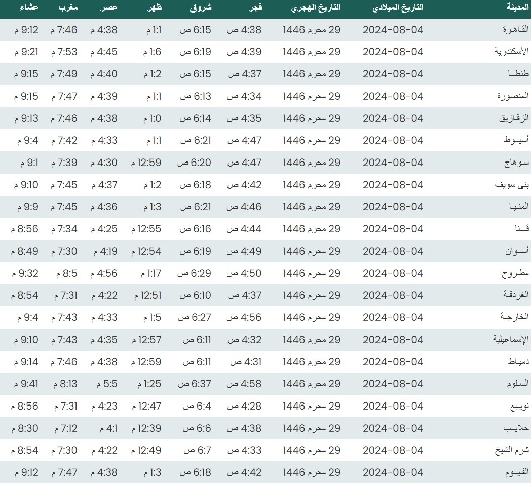 وفيما يلي مواقيت الصلاة، لعدد من مدن ومحافظات الجمهورية من واقع بيانات الهيئة العامة للمساحة