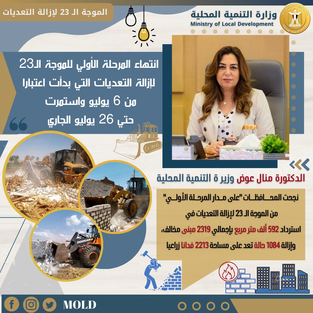 كما وجهت وزيرة التنمية المحلية، غرفة العمليات وإدارة الأزمات بالوزارة بالمتابعة على مدار اليوم لنتائج الإزالات عند استكمال باقي مراحل الموجة الـ 23 والتي ستنتهي في 20 سبتمبر القادم والتنسيق مع المحافظات لتذليل أي معوقات وتنفيذ الإزالات عبر المتابعة مع غرف العمليات المصغرة التي تم تشكيلها بكل محافظة برئاسة السكرتير العام المساعد وتضم في عضويتها ممثل من كل من مديرية الأمن وجهات الولاية وإدارة الأملاك بالمحافظة.