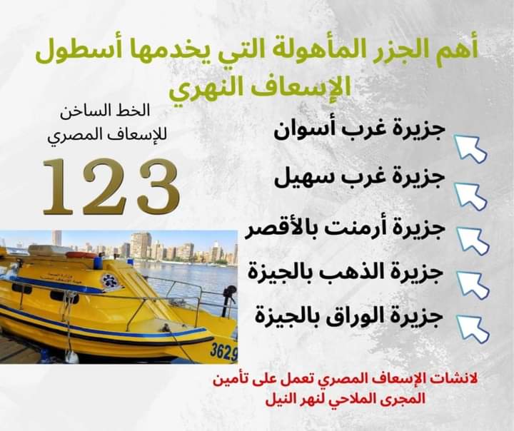اعلنت هيئة الإسعاف المصرية عن تقديم خدمات الإسعاف النهري للجزر المأهولة بالسكان منها: