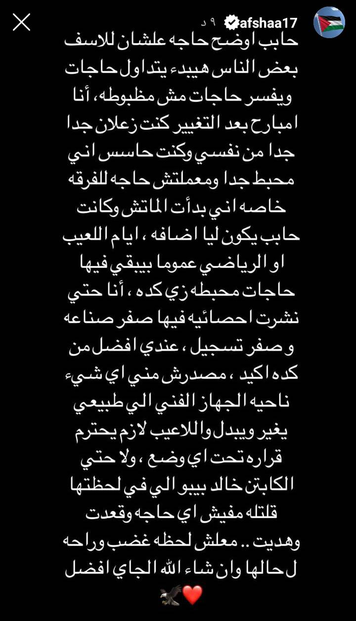 وتضمن منشور أفشة أن غضبه جاء بسبب غيرته على فريقه وعدم رضاء عن أداءه بالملعب، وأنه لم يفيد الفريق بشيء مؤكدا أنه لم يعترض على التغيير أو على الجهاز الفني لأنه يحترم قراره وما قام به بتغييره شيء طبيعي لأنه غير مفيد للفريق في تلك المباراة.