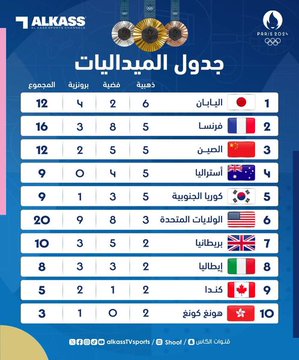 فرنسا تطارد اليابان على الصدارة، الترتيب العام للميداليات في أولمبياد باريس