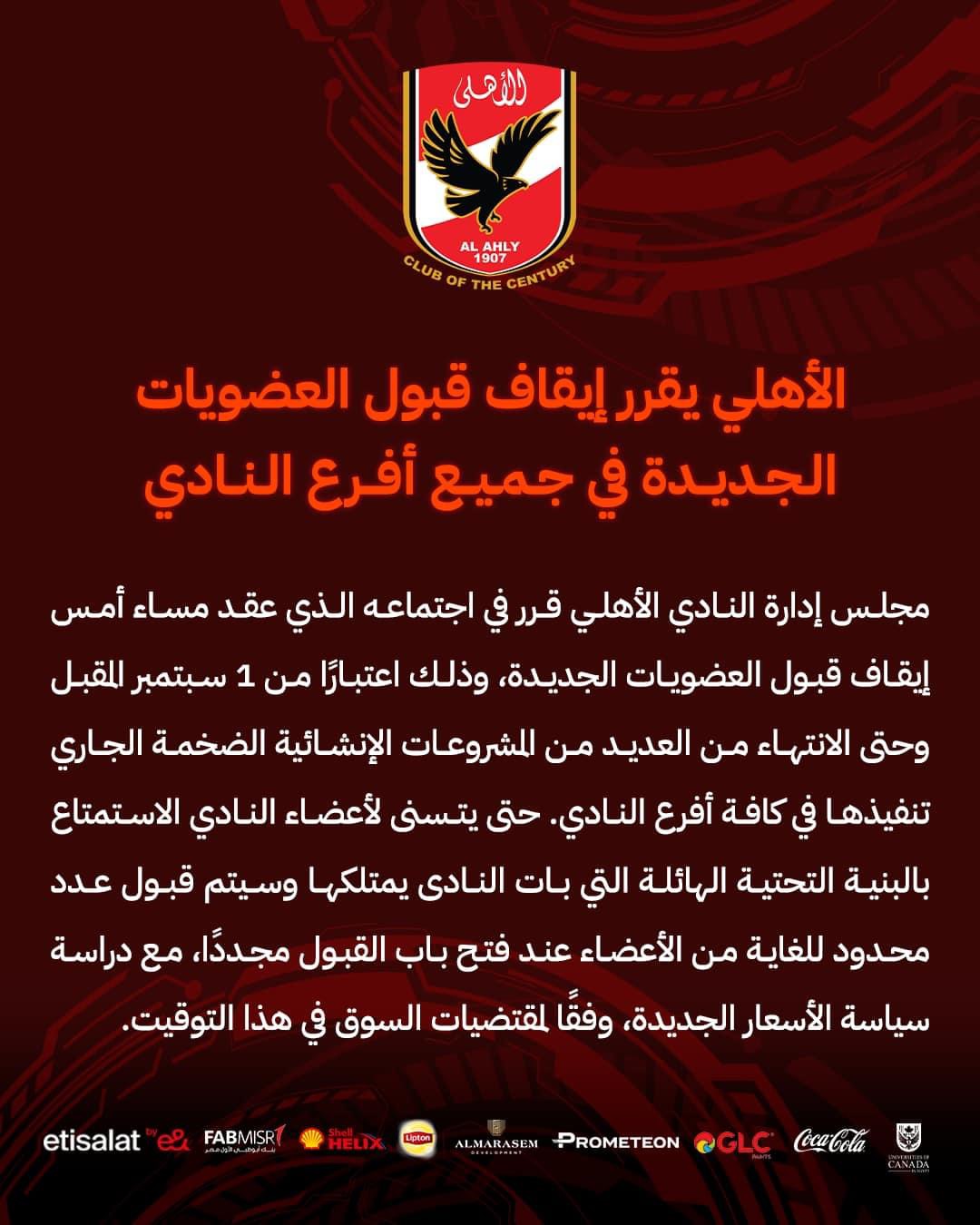 قرر مجلس إدارة النادي الأهلي في اجتماعه الذي عقد مساء أمس إيقاف قبول العضويات الجديدة، وذلك اعتبارًا من 1 سبتمبر المقبل وحتى الانتهاء من المشروعات الإنشائية الضخمة الجاري تنفيذها في كل فروع النادي.