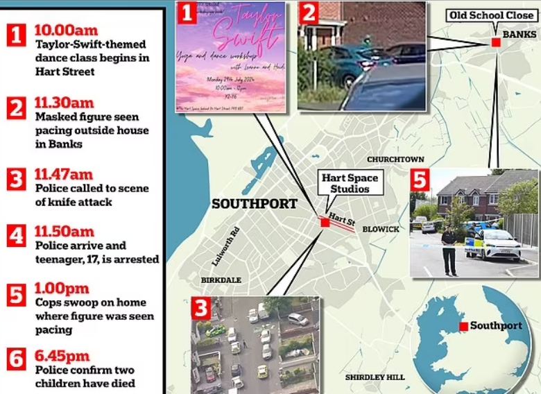 وحسب هيئة الإذاعة البريطانية، قتلت ثلاث فتيات صغيرات جراء هجوم وحشي بالسكين في ساوثبورت، أثناء حضور حفل رقص ويوجا كان يحمل عنوان "تايلور سويفت".