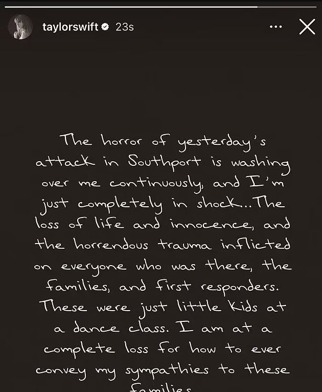 وكتبت تايلور سويفت لمعجبيها: إنها في حالة صدمة كاملة بسبب فقدان الحياة والبراءة، متابعة، إن رعب الهجوم الذي وقع في ساوثبورت يغمرني باستمرار وأنا في حالة صدمة تامة، خسارة الأرواح والبراءة، والصدمة المروعة التي تعرض لها كل من كان هناك، والأسر، ورجال الإنقاذ، كان هؤلاء مجرد أطفال صغار في درس للرقص، أنا في حيرة تامة من أمري ولا أعرف كيف أعبر عن تعاطفي مع هؤلاء الأسر.