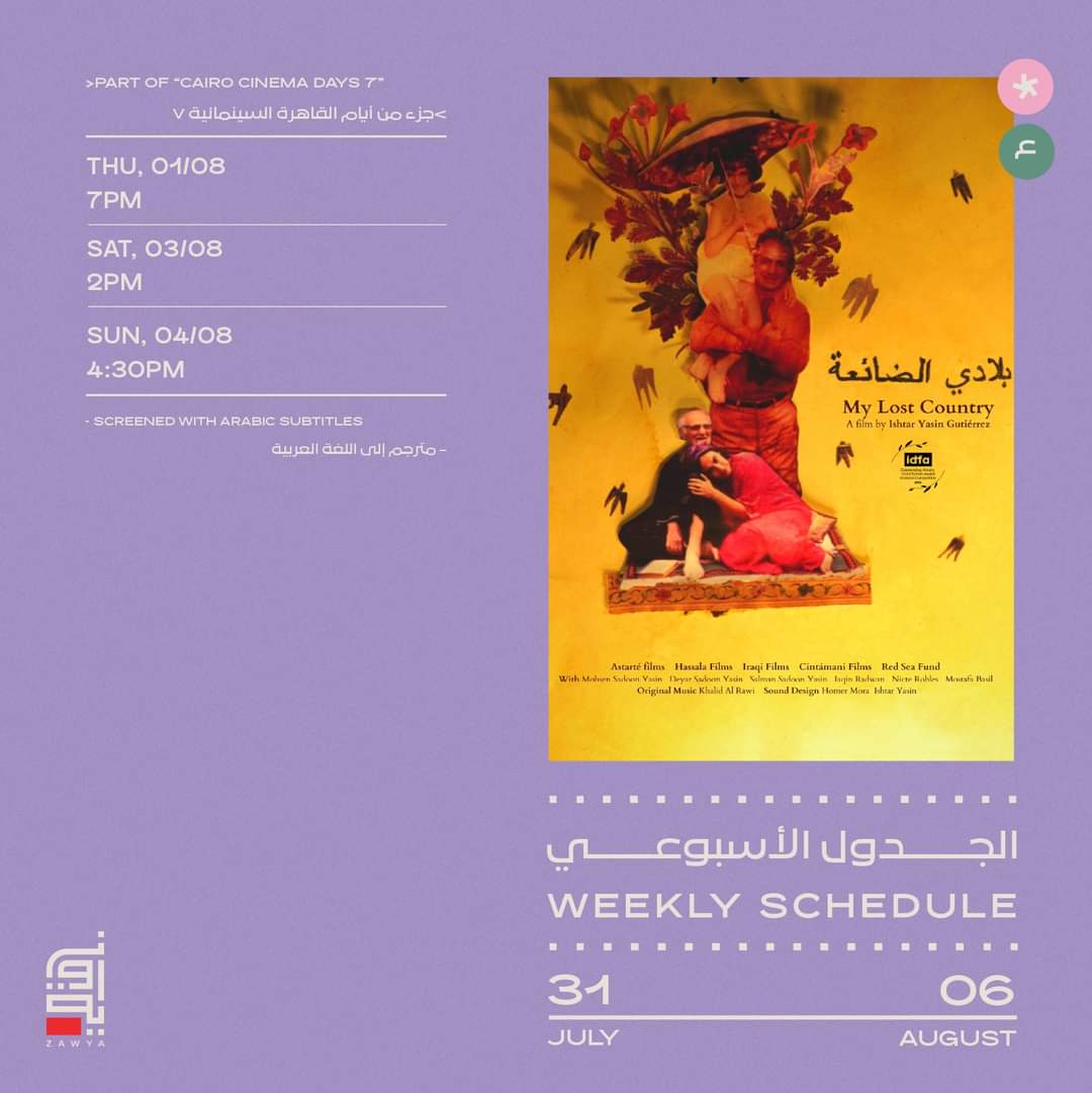 كما يعرض فيلم "بلادي الضائعة" للمخرجة عشتار ياسين نجلة المسرحي العراقي محسن سعدون ياسين. قضى سعدون معظم حياته بعيدًا عن بلاده العراق، فصنعت له ابنته عشتار ياسين جوتيريز فيلم مليء بالمحبة، تعبر فيه عن مشاعر مرثية لوطن لا يمكنهم العودة إليه لأنه لم يعد نفس المكان الذي يشبه ذاكرتهم، وأيضًا لأنه ربما كان معنى الوطن دائمًا حلمًا أكثر من كونه واقع.